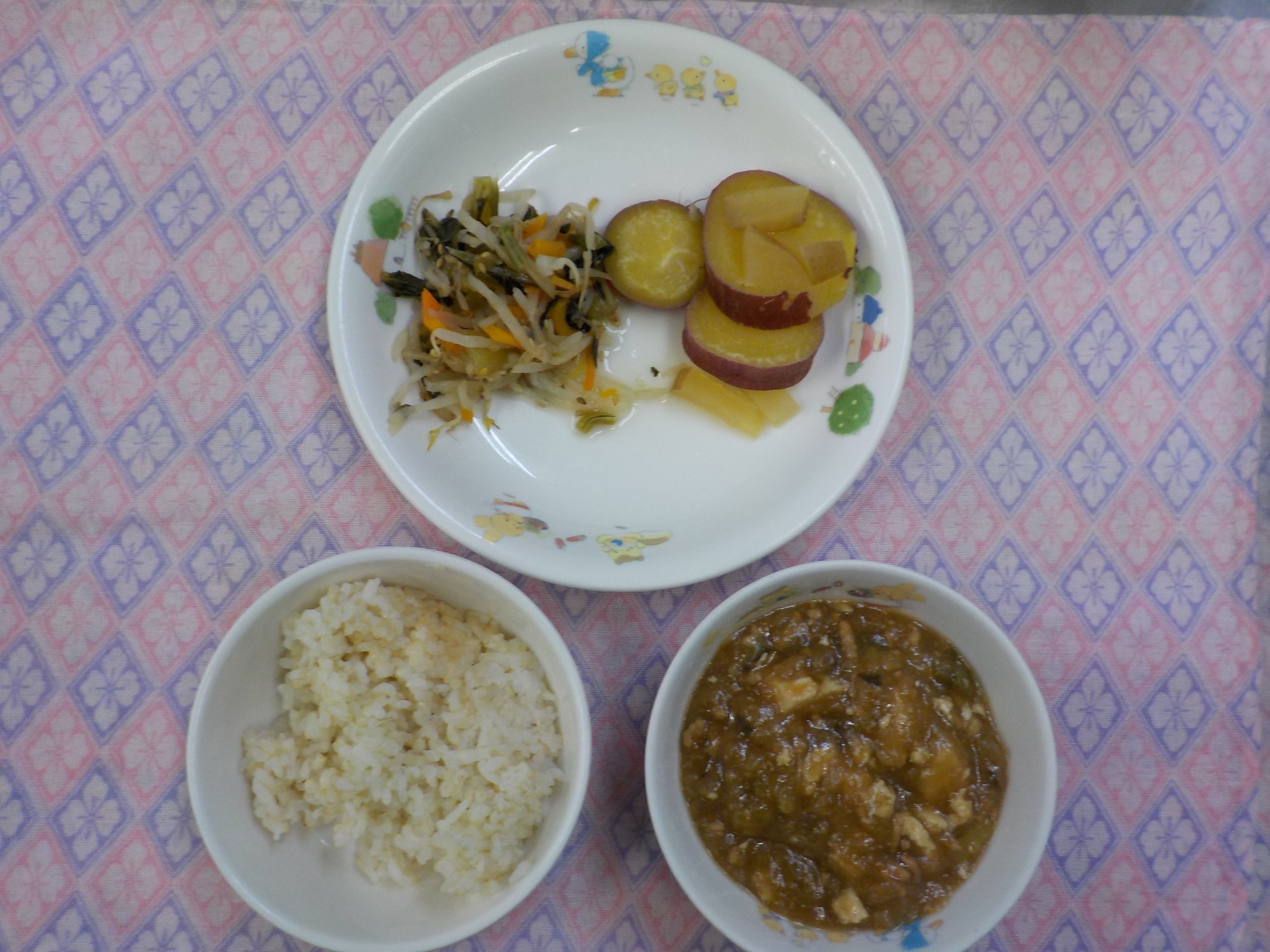 【12/5(金)夕食】麻婆豆腐・さつま芋とりんごの甘煮・小松菜のナムル