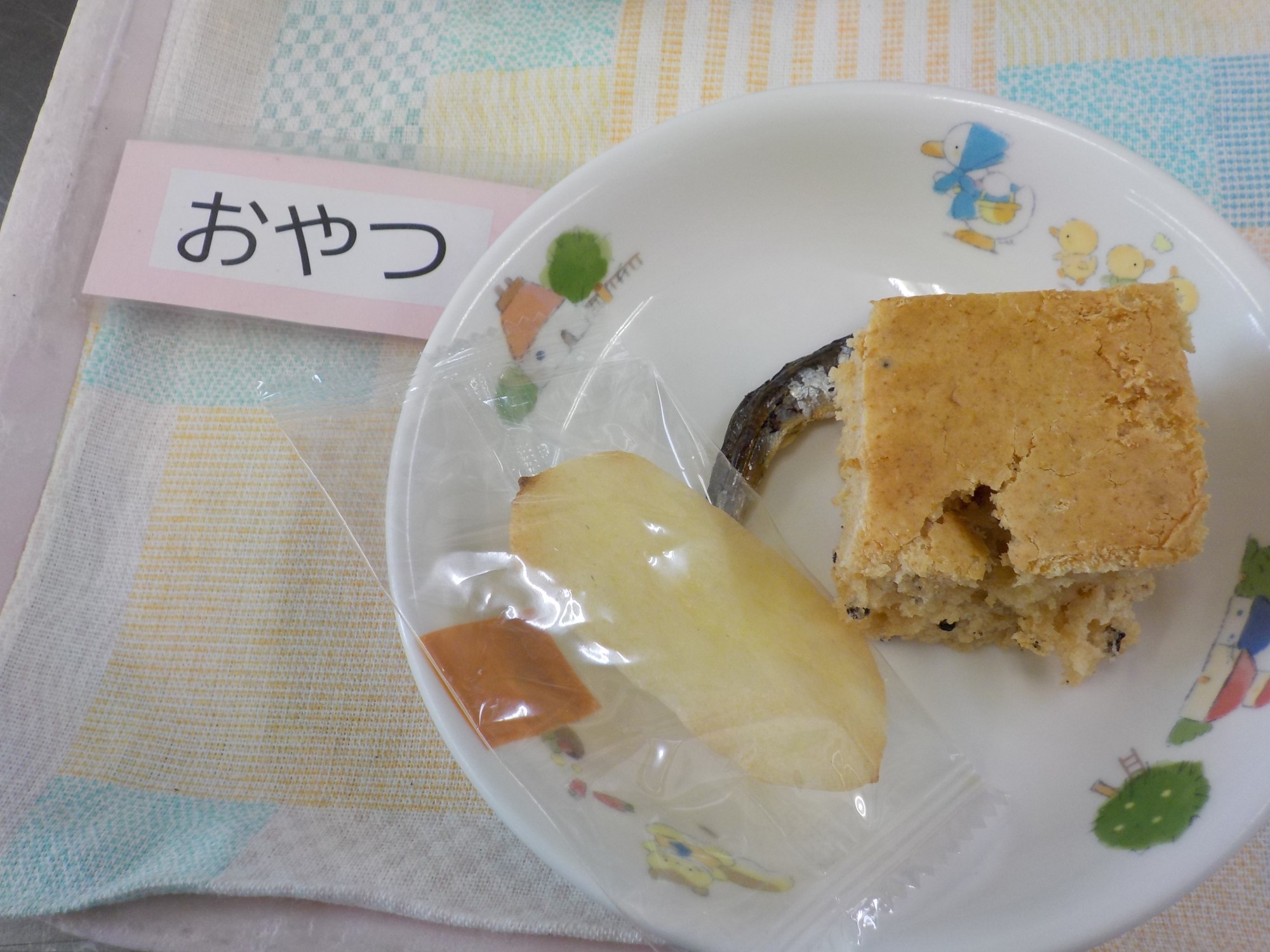 【おやつ】牛乳・黒ごまきな粉ケーキ・ゆかりじゃこ・お菓子