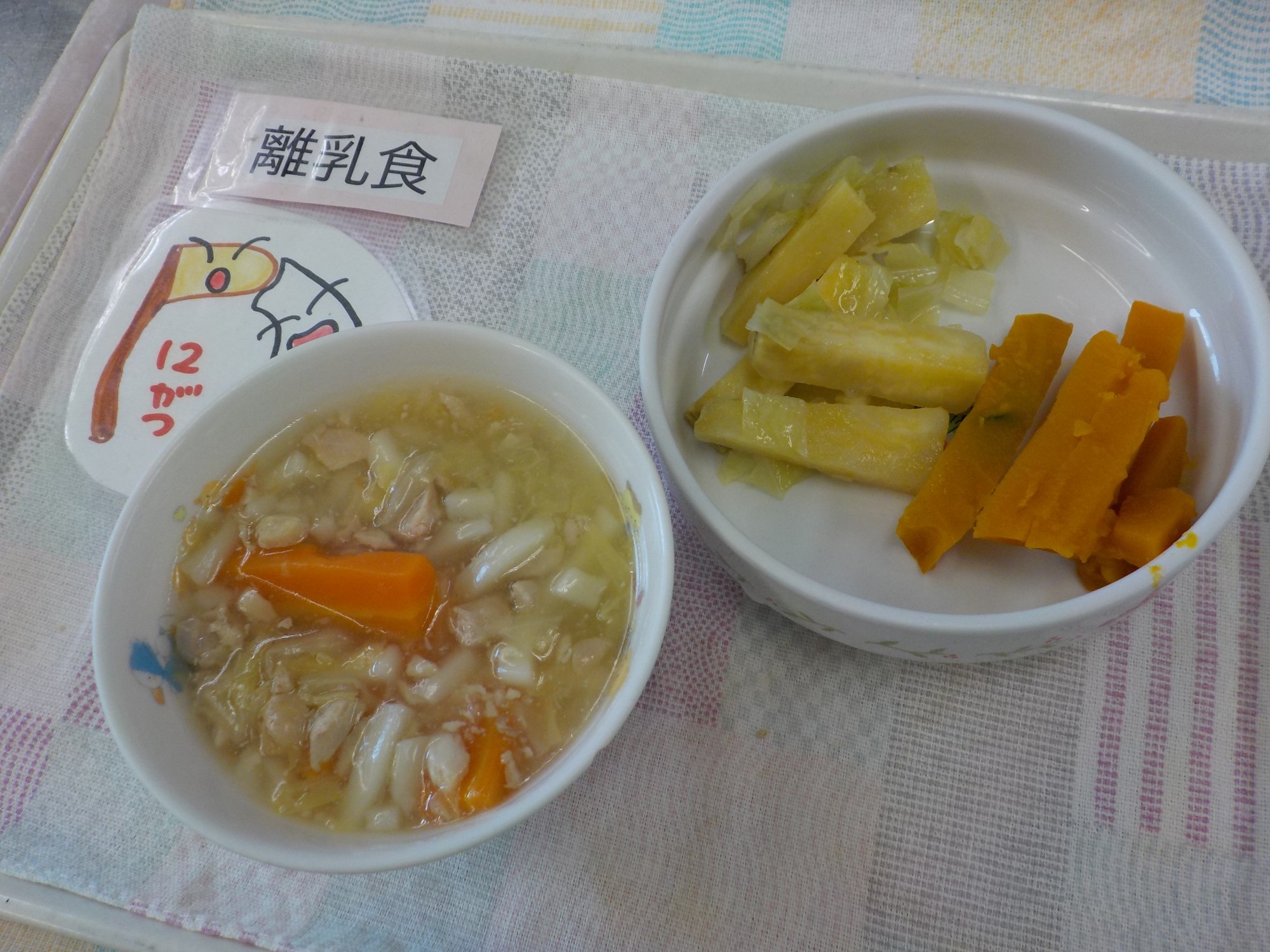 【離乳食】あんかけうどん・蒸し南瓜・おさつ和え