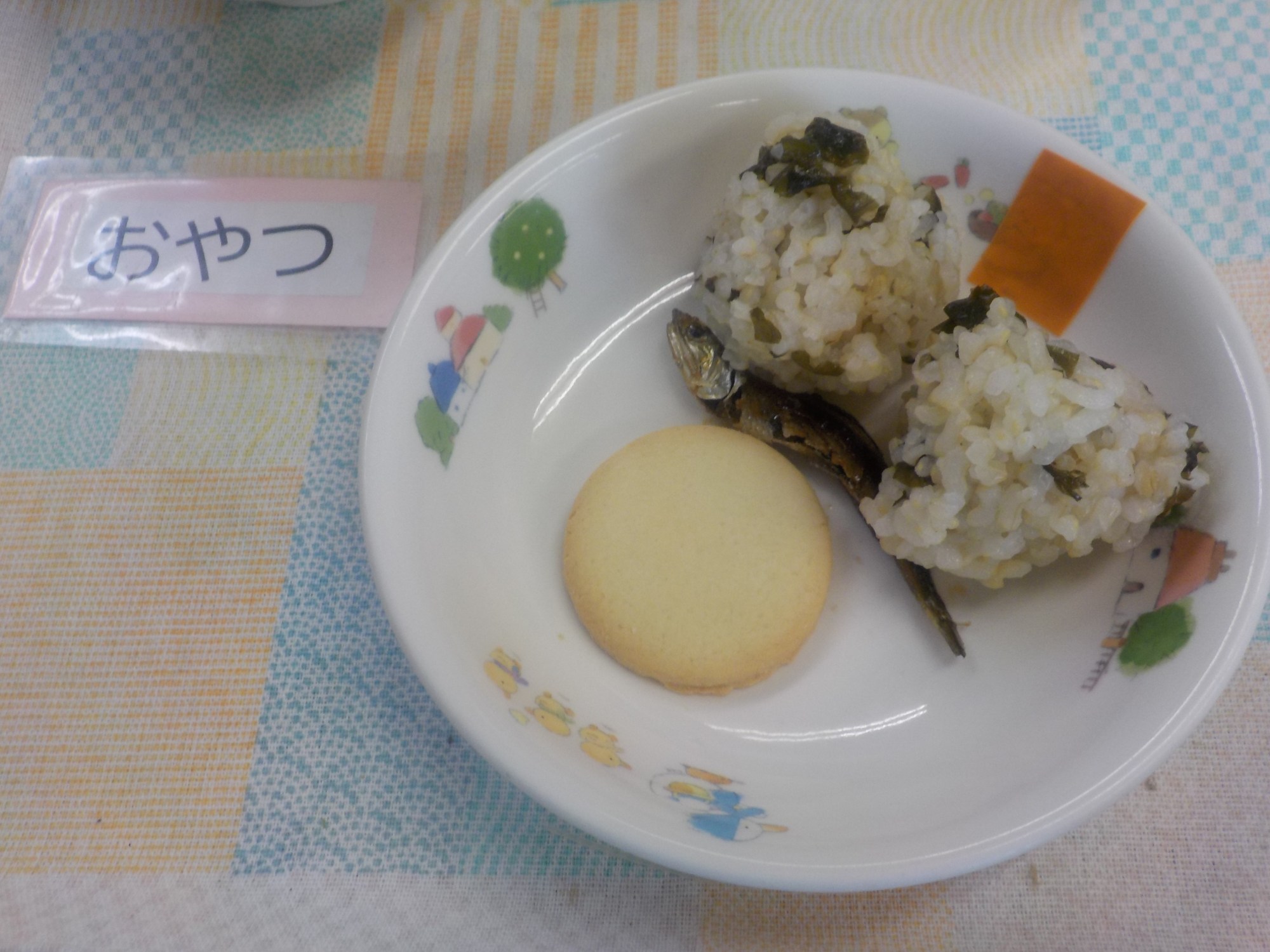 【おやつ】牛乳・わかめおにぎり・甘辛じゃこ・お菓子