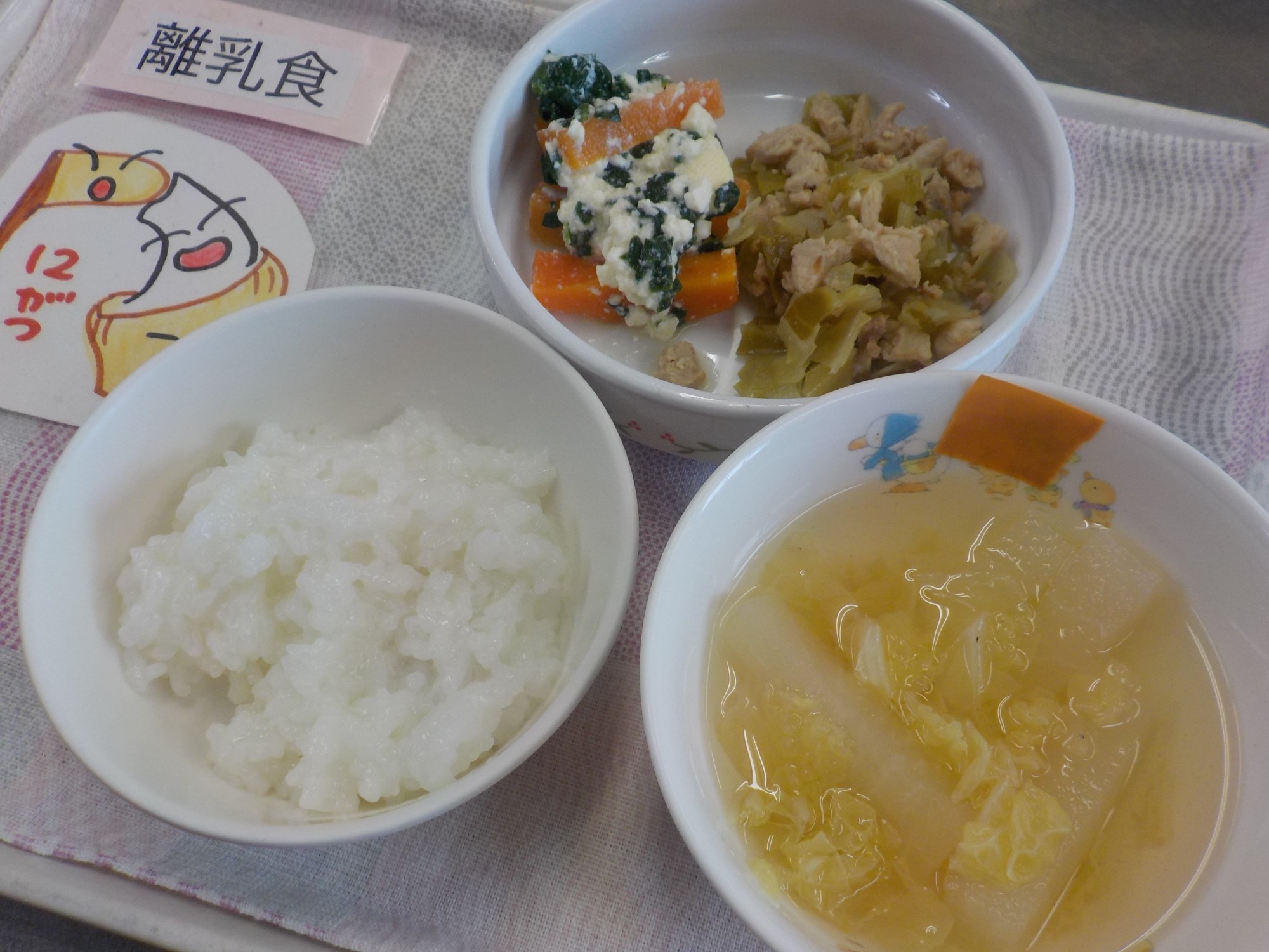 【離乳食】鶏肉のおかか炒め・白和え・みそけんちん汁