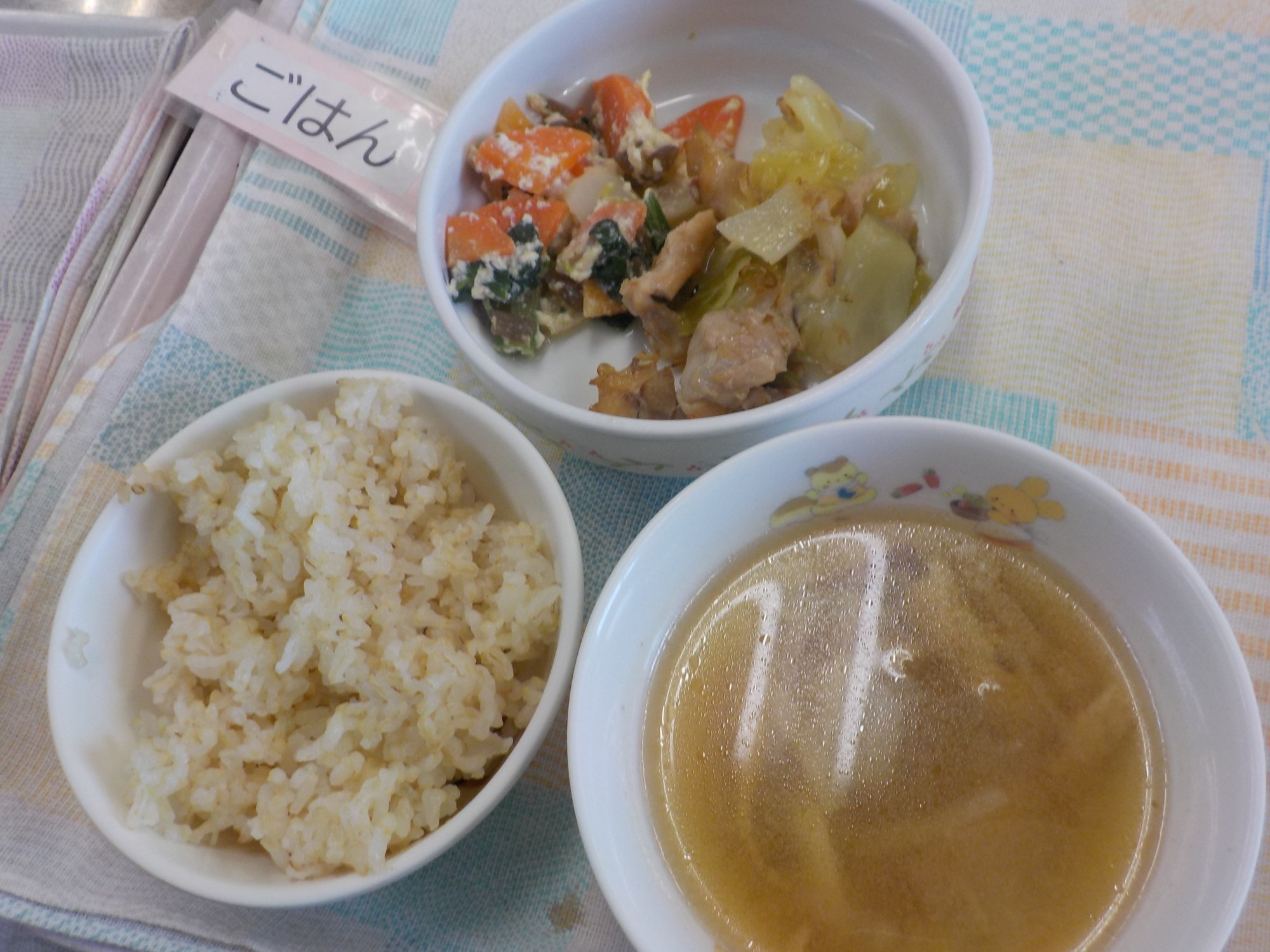 【ごはん】鶏肉のおかか炒め・きなこ白和え・みそけんちん汁
