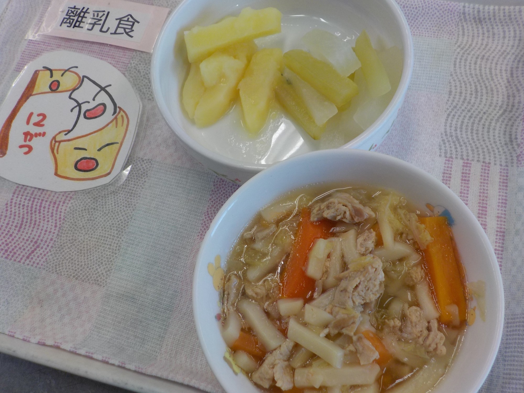 【離乳食】醤油うどん・粉ふき芋・胡瓜の和え物
