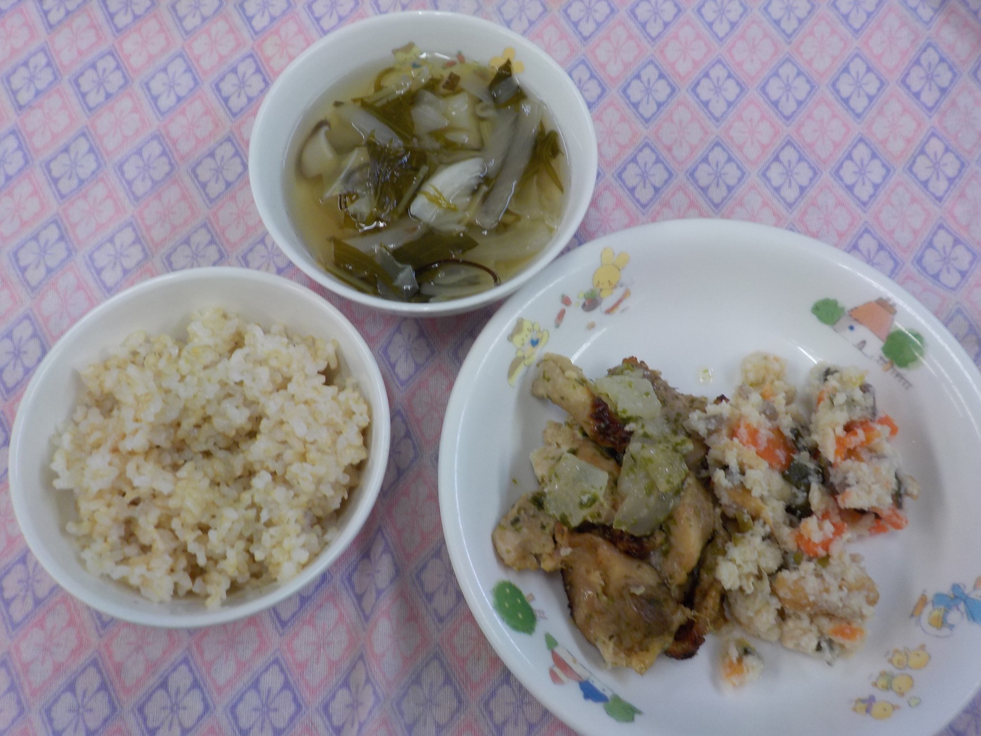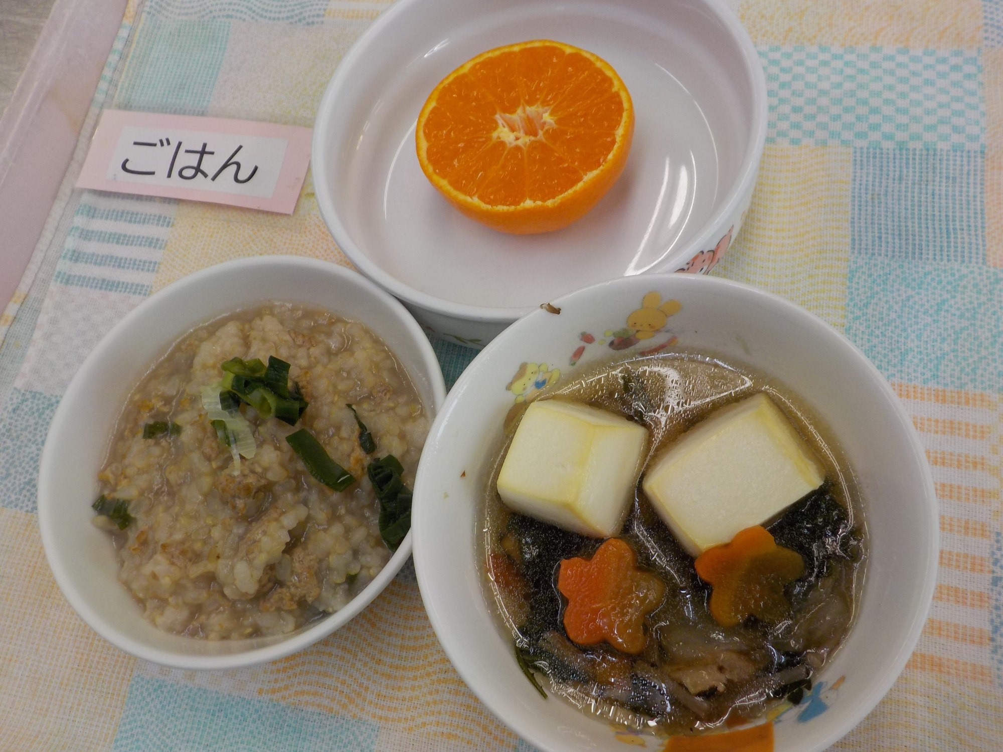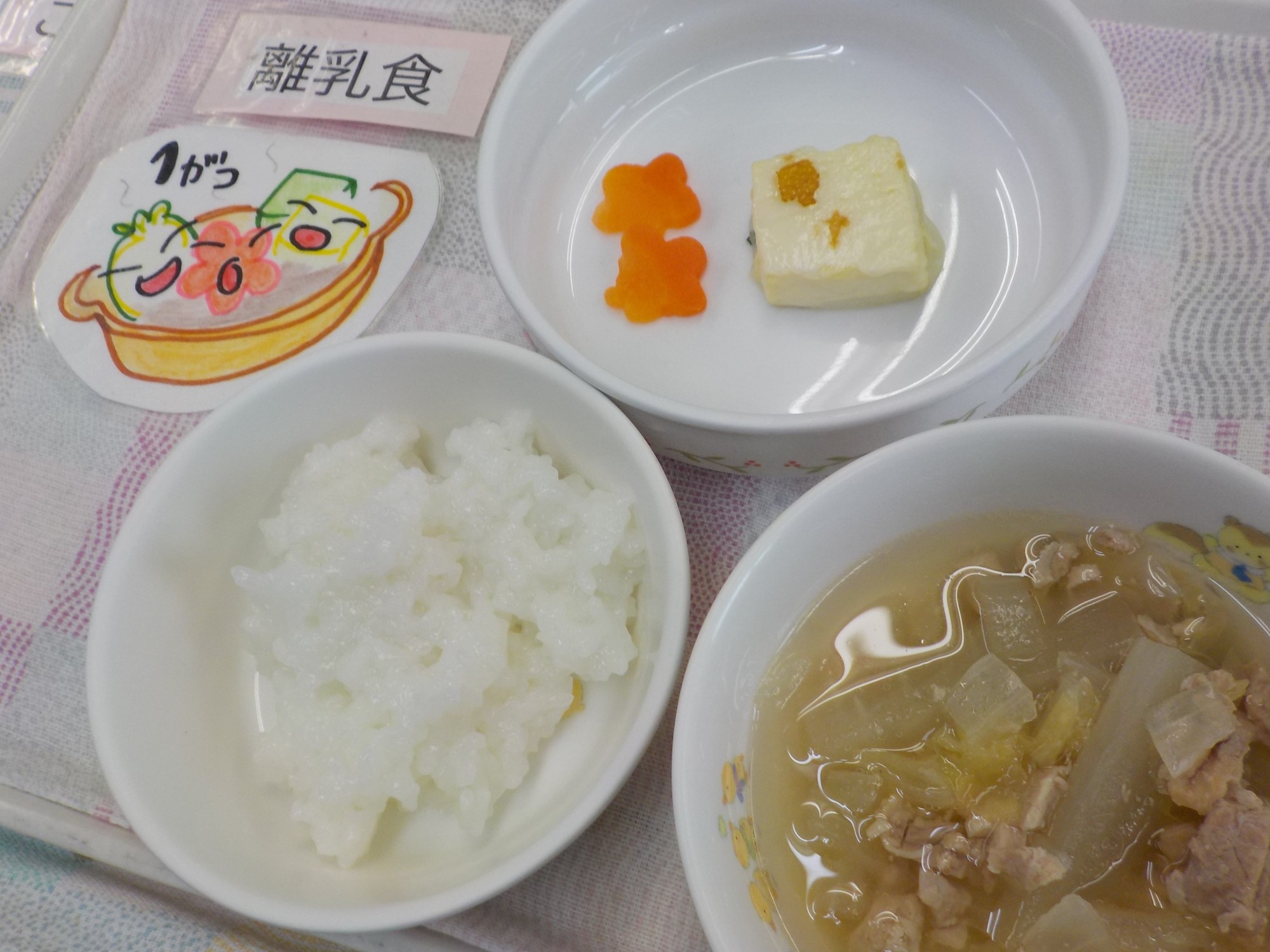 【Hanaキッチン】1/14(水) 今日のごはんとおやつ Hana 2026.01.14 <園のごはんを紹介することで、食に対する取り組みを知ってもらう><誕生会でした!>ふるさとの山城の味が詰まった鍋が登場しました。鍋の名前の由来は、法人のさんちゃんマーク『じょー(情)ちゃん、どー(動)ちゃん、ちー(知)ちゃん』を意味します。【ごはん】さんちゃん鍋・雑炊・くだもの(みかん)【おやつ】プリン(卵不使用)ごまじゃこ・お菓子【離乳食】鶏肉の煮物・豆腐ステーキ・花形人参