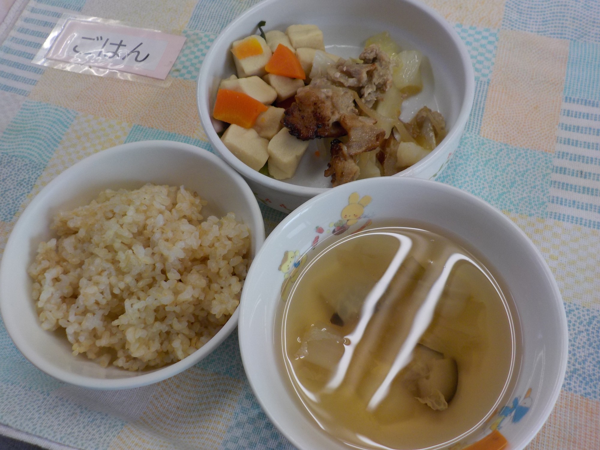 【ごはん】豚肉のソース炒め・高野豆腐の煮物・煮干だしのすまし汁