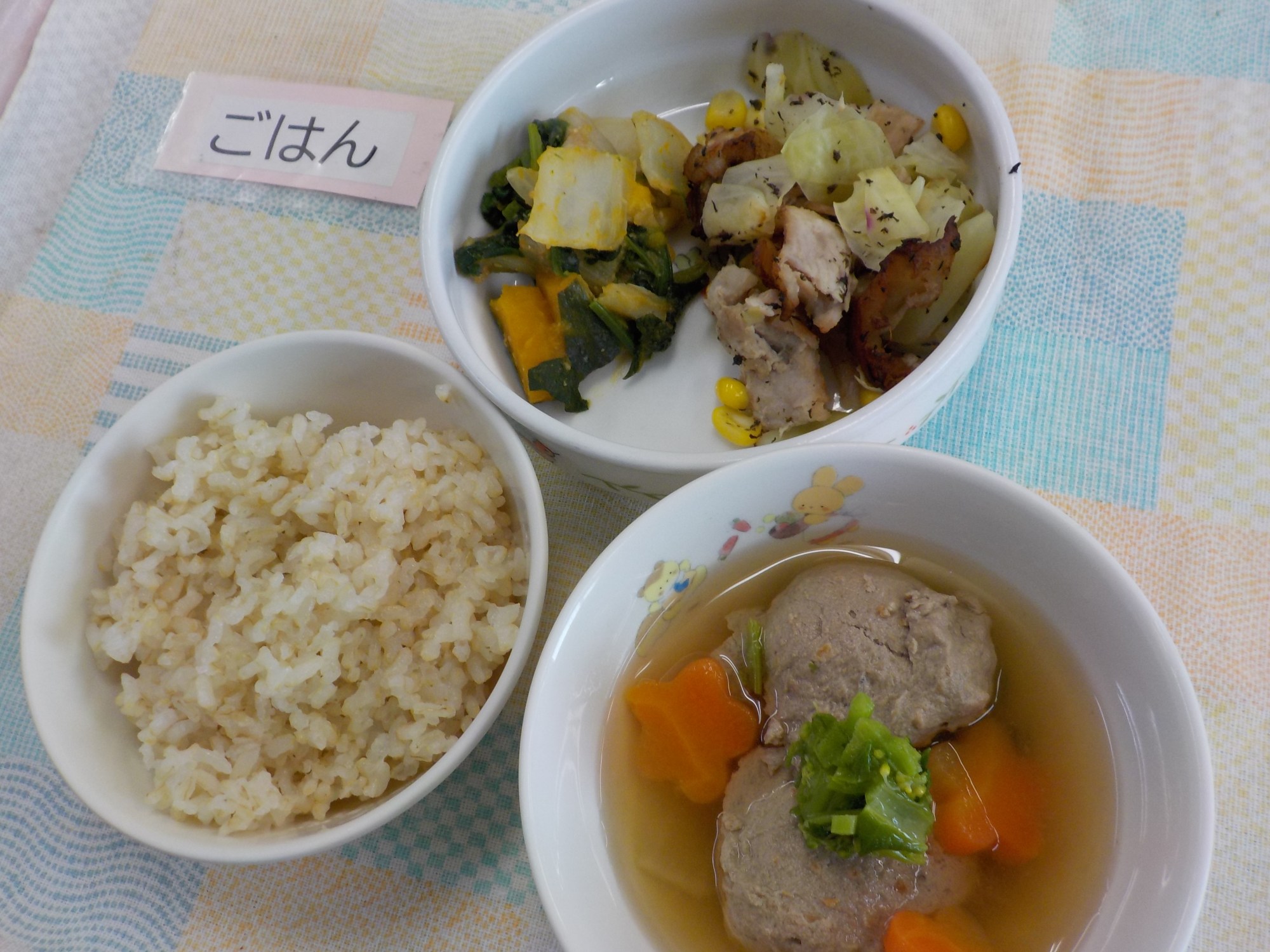 【ごはん】豚肉のゆかり焼き・白菜のきな粉和え・菜の花とイワシのつみれみそ汁