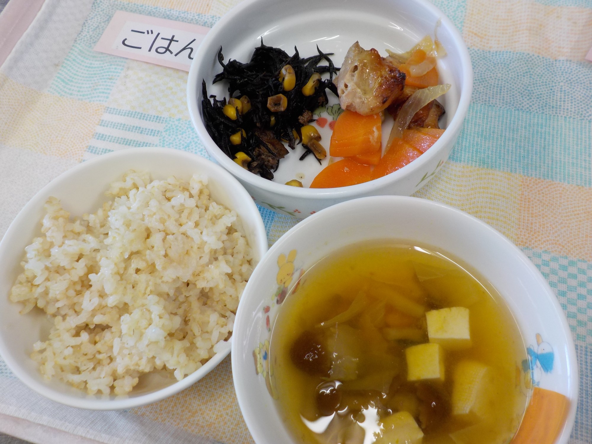 【ごはん】鶏肉のおかか焼き・ひじきの煮物・なめこの和風スープ