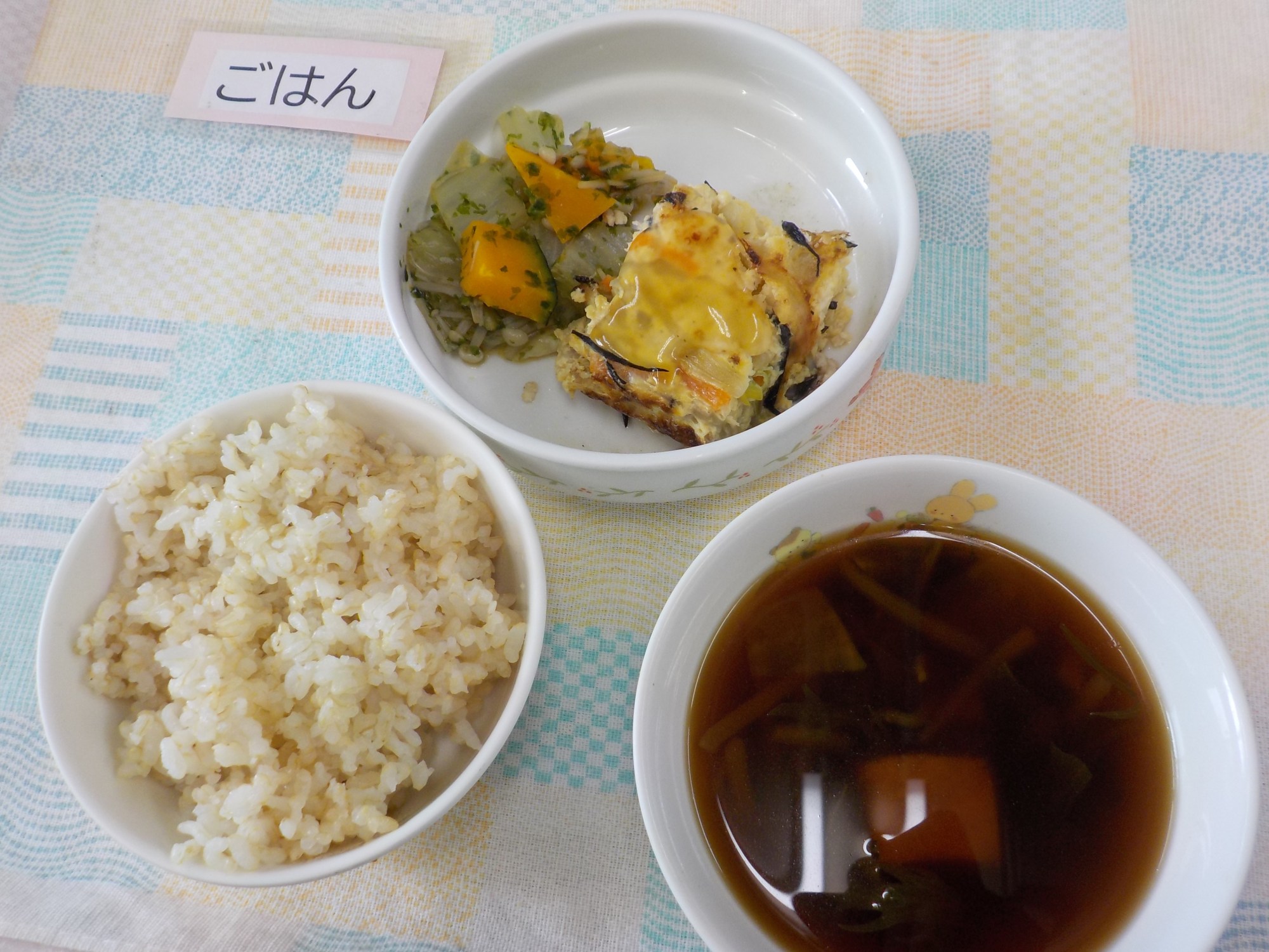 【ごはん】千草焼き・青のり和え・赤だしみそ汁