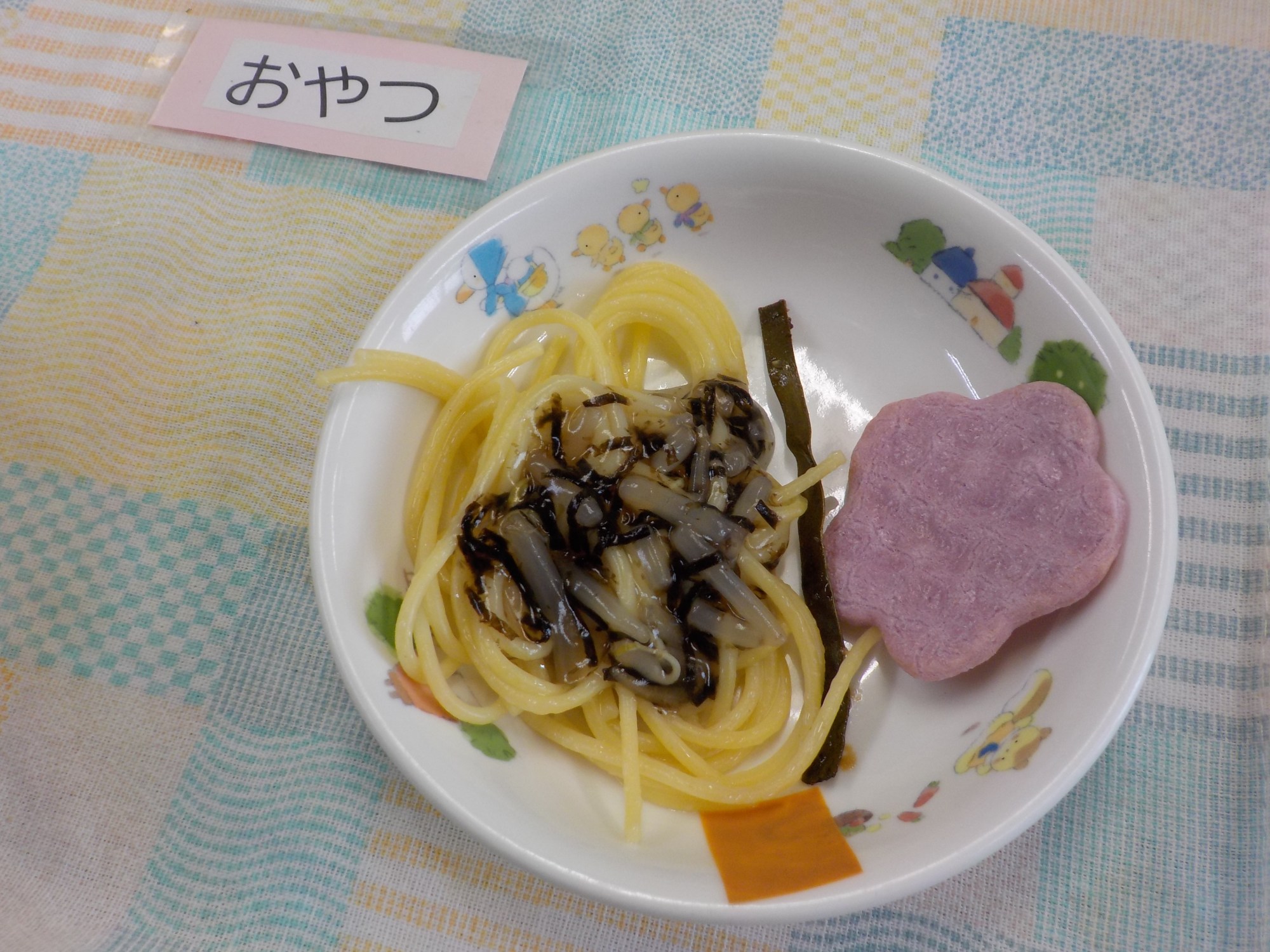【おやつ】牛乳・和風スパゲティ・ごまこんぶ・お菓子