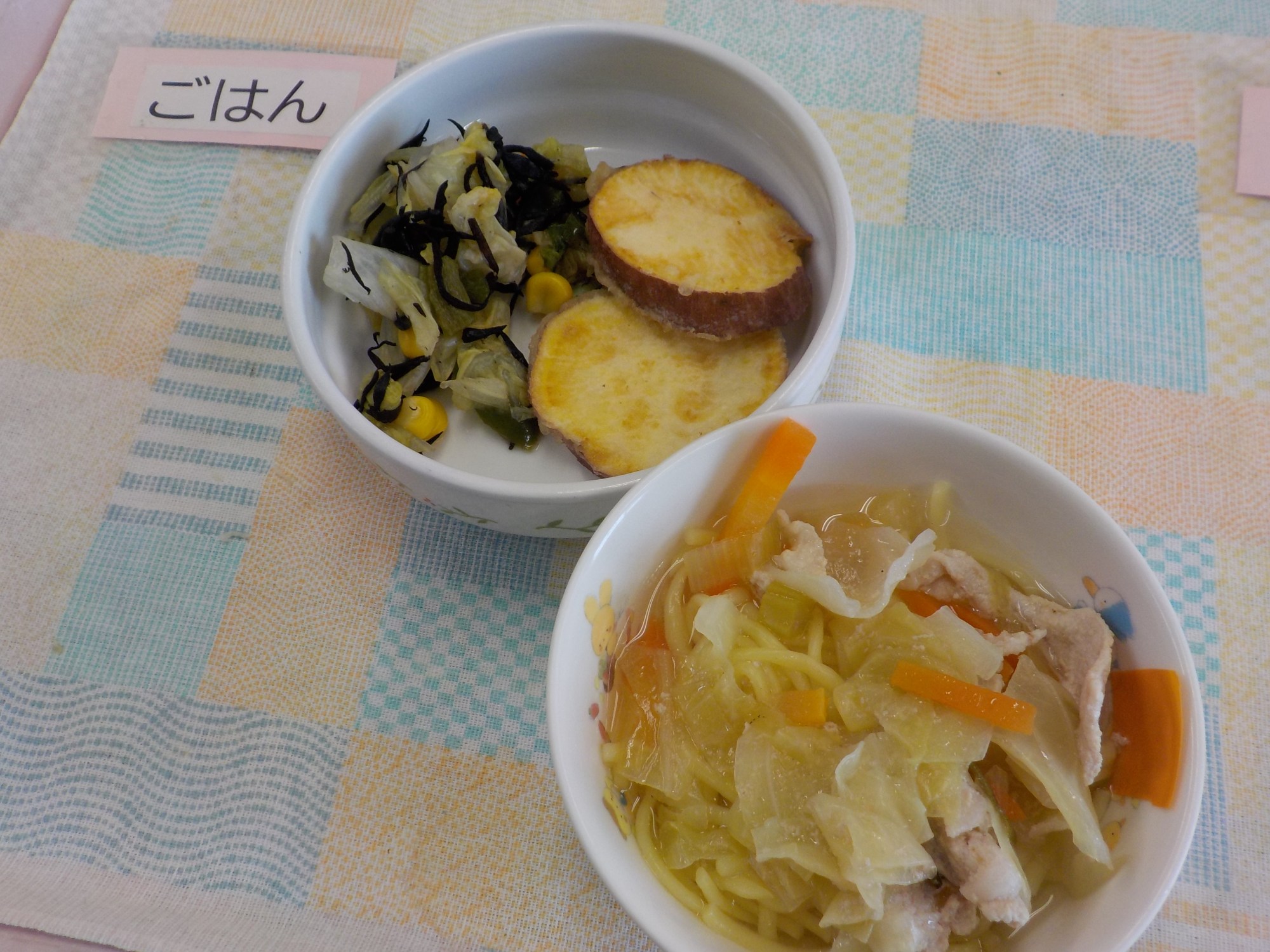 【ごはん】塩ラーメン・さつま芋の天ぷら・ひじきの和え物