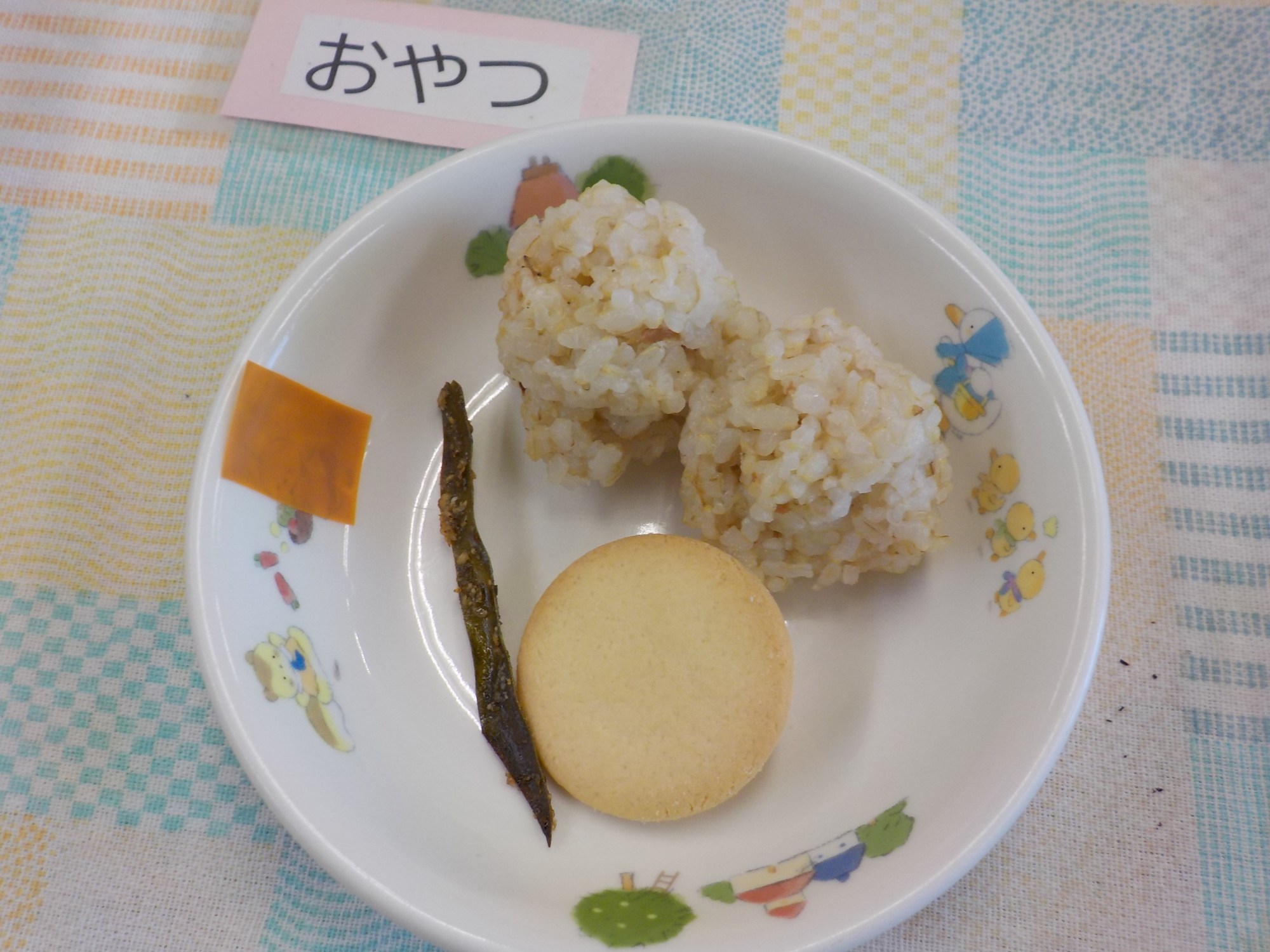 【おやつ】牛乳・梅とおかかのおにぎり・ごまこんぶ・お菓子