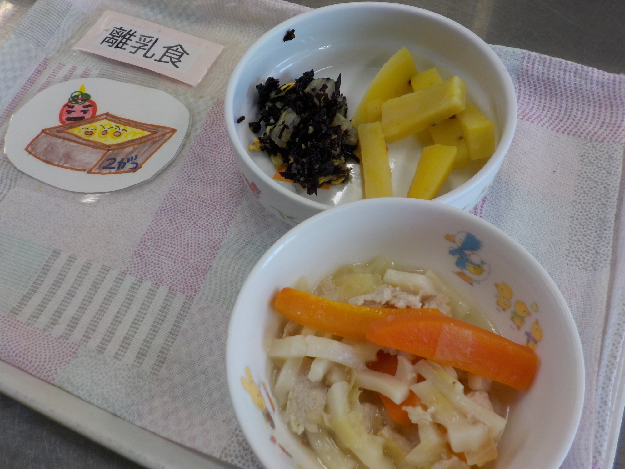 【離乳食】塩うどん・ふかし芋・ひじきの和え物