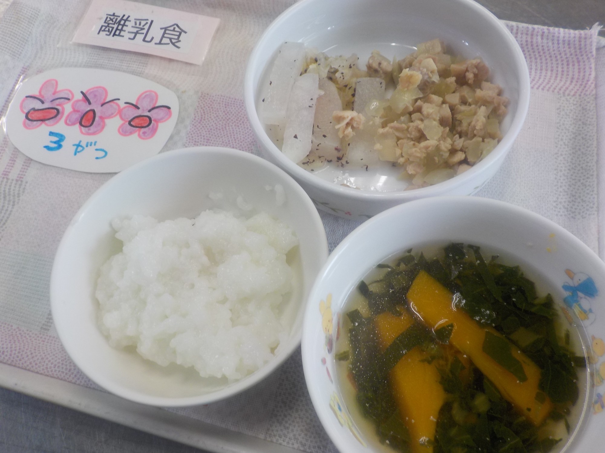 【離乳食】鶏肉の塩焼き・ゆかり和え・ごま入りすまし汁