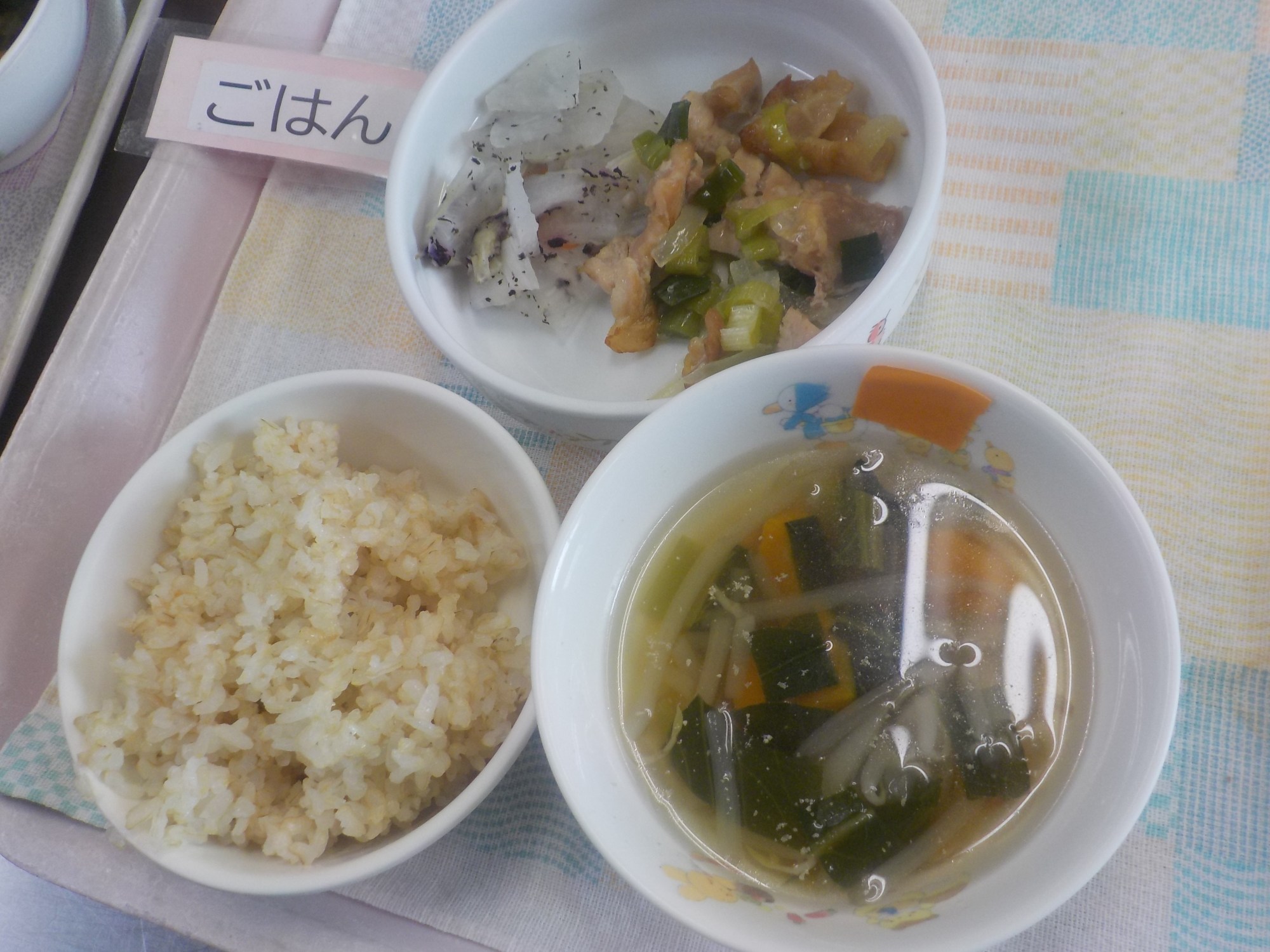 【ごはん】鶏肉のネギ塩焼き・ゆかり和え・ごま入りすまし汁