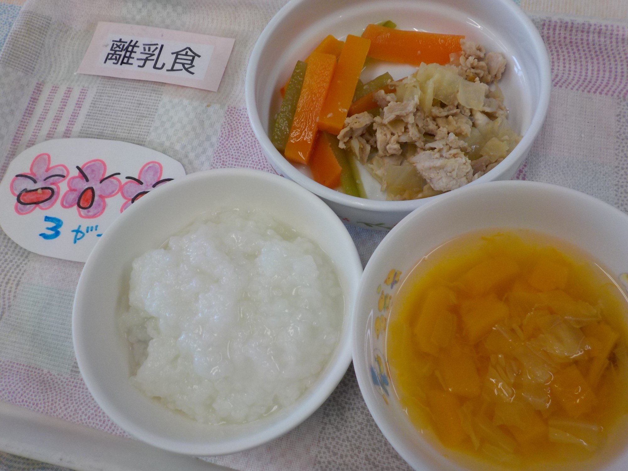 【離乳食】豚肉の醤油焼き・人参のサラダ・白菜のスープ