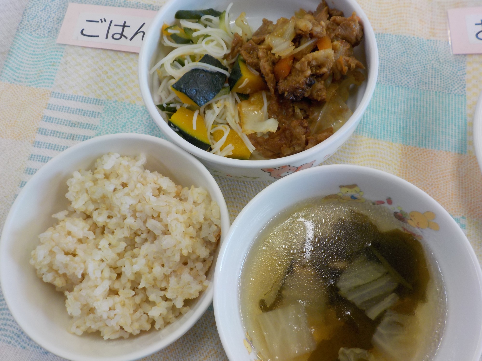 【離乳食】豚肉の醤油焼き・人参のサラダ・白菜のスープ