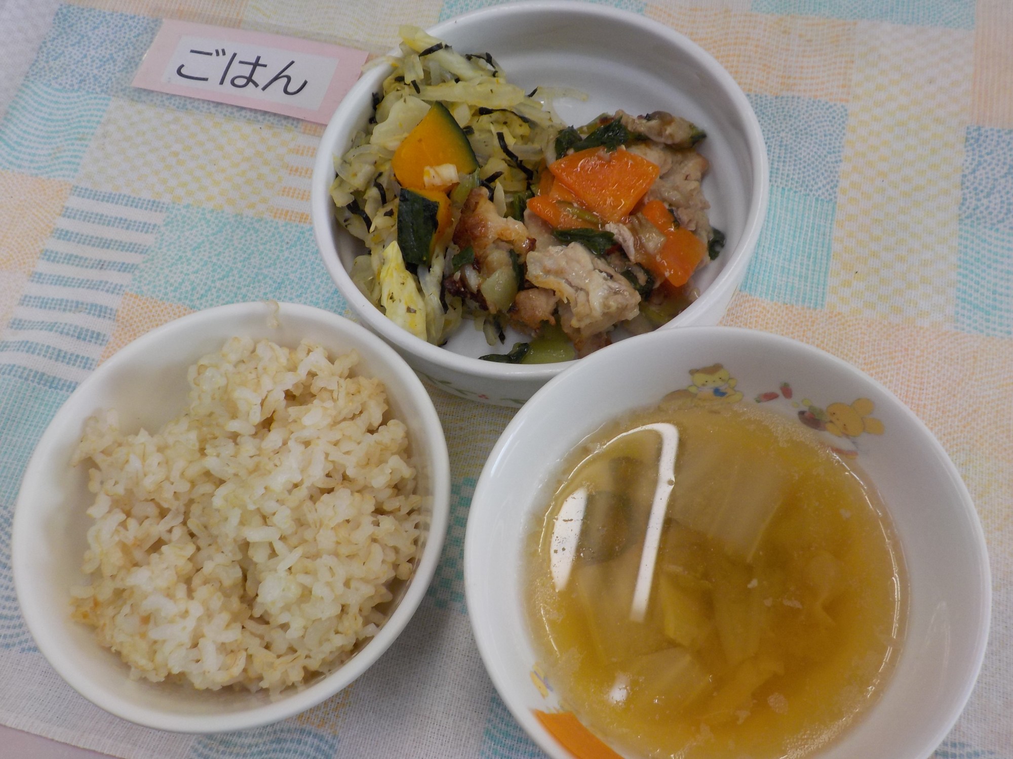【ごはん】豚肉とチンゲン菜のあん炒め・のりと春雨の和え物・そぼろみそ汁