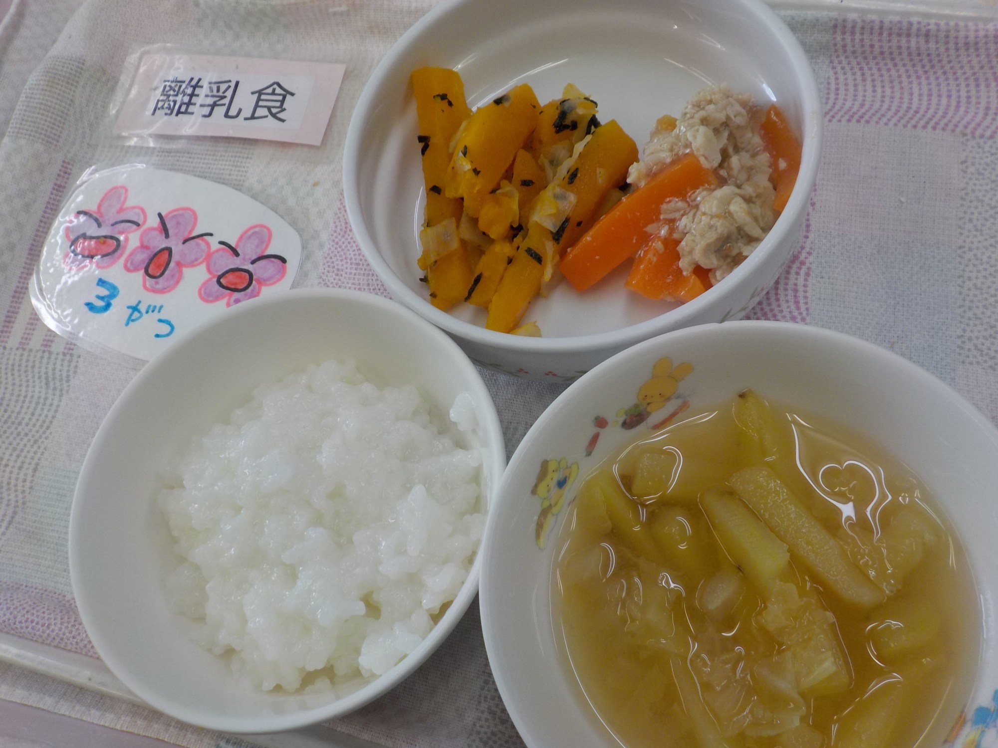 【離乳食】豚肉のあん炒め・のり和え・白菜のみそ汁
