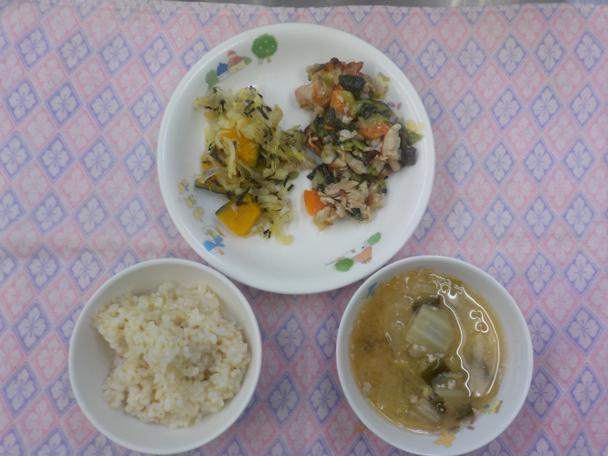 【3/13(金)夕食】豚肉とチンゲン菜のあん炒め・のりと春雨の和え物・そぼろみそ汁