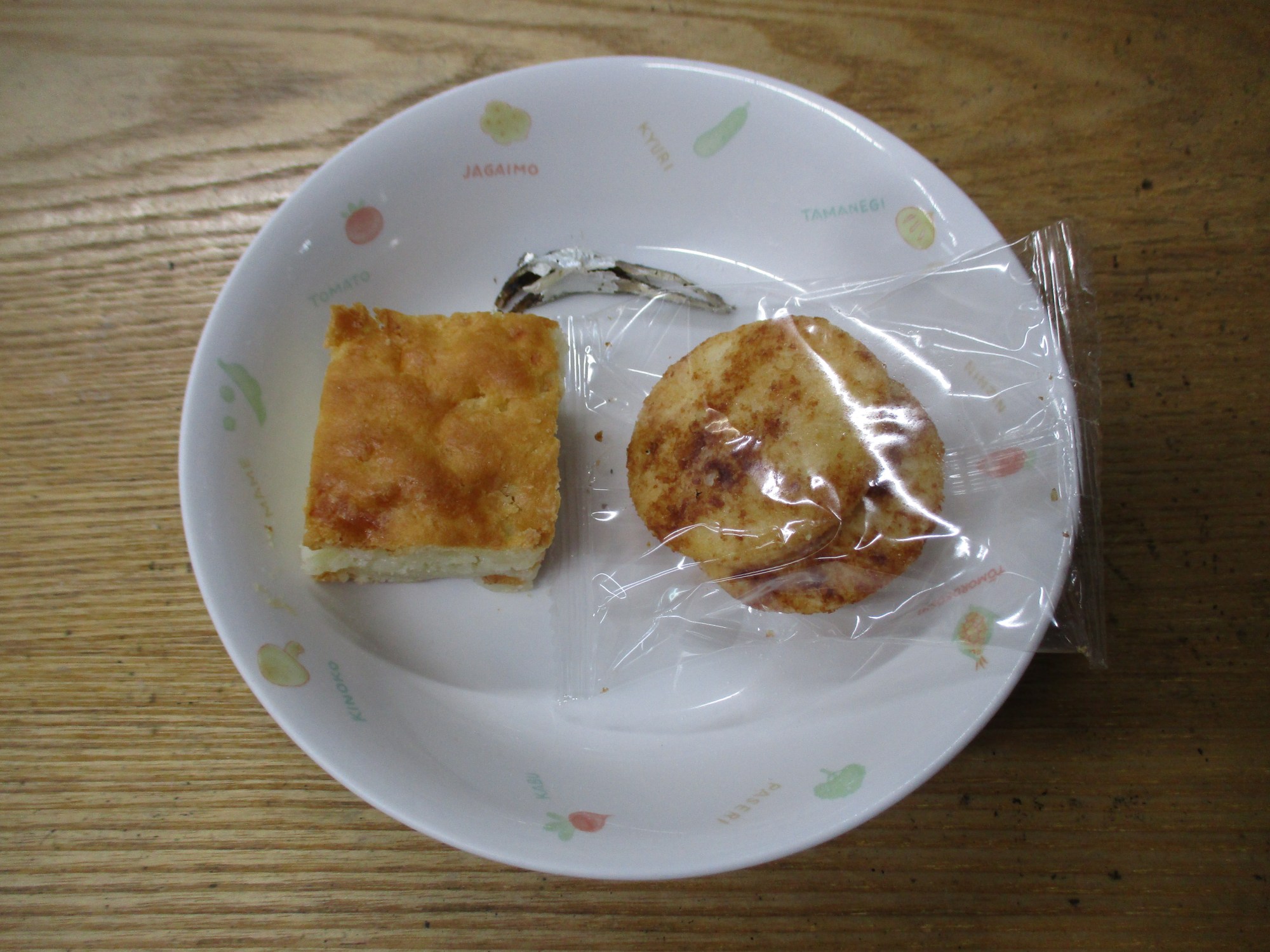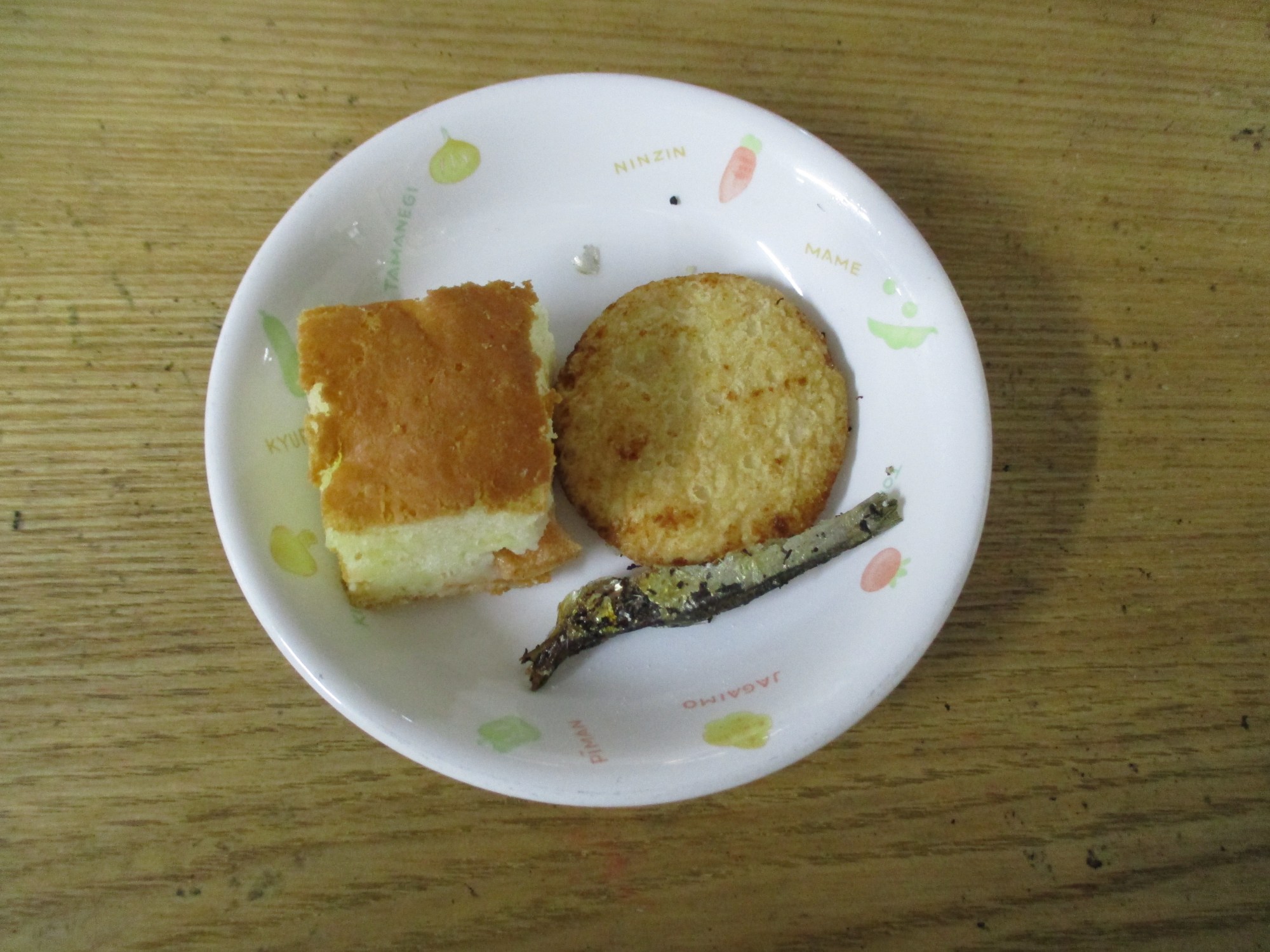1枚目:【おやつ:以上児】柿とチーズのホットケーキ・ゆかりじゃこ・お菓子
