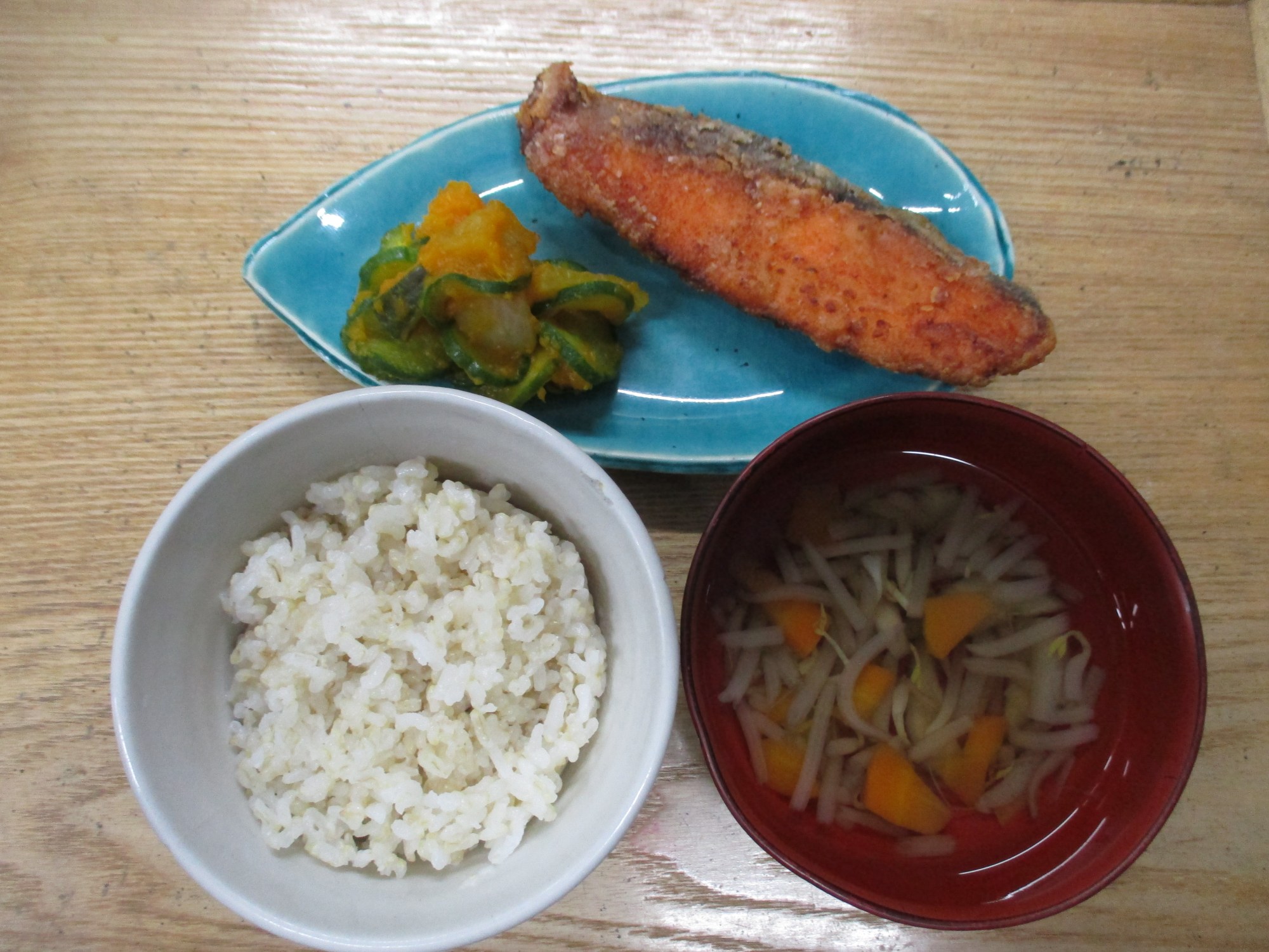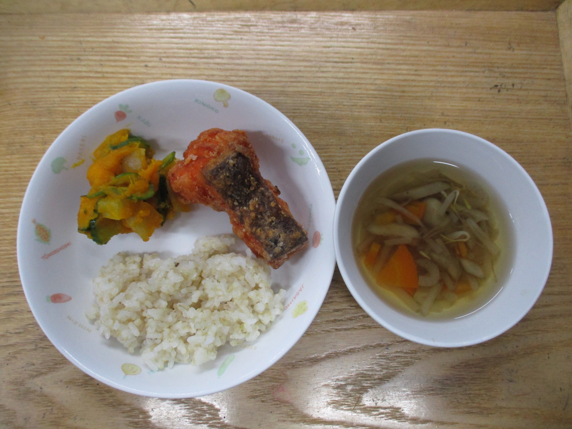 1枚目:【普通食:以上児】サケの唐揚げ・南瓜の和え物・ごぼうのお吸い物