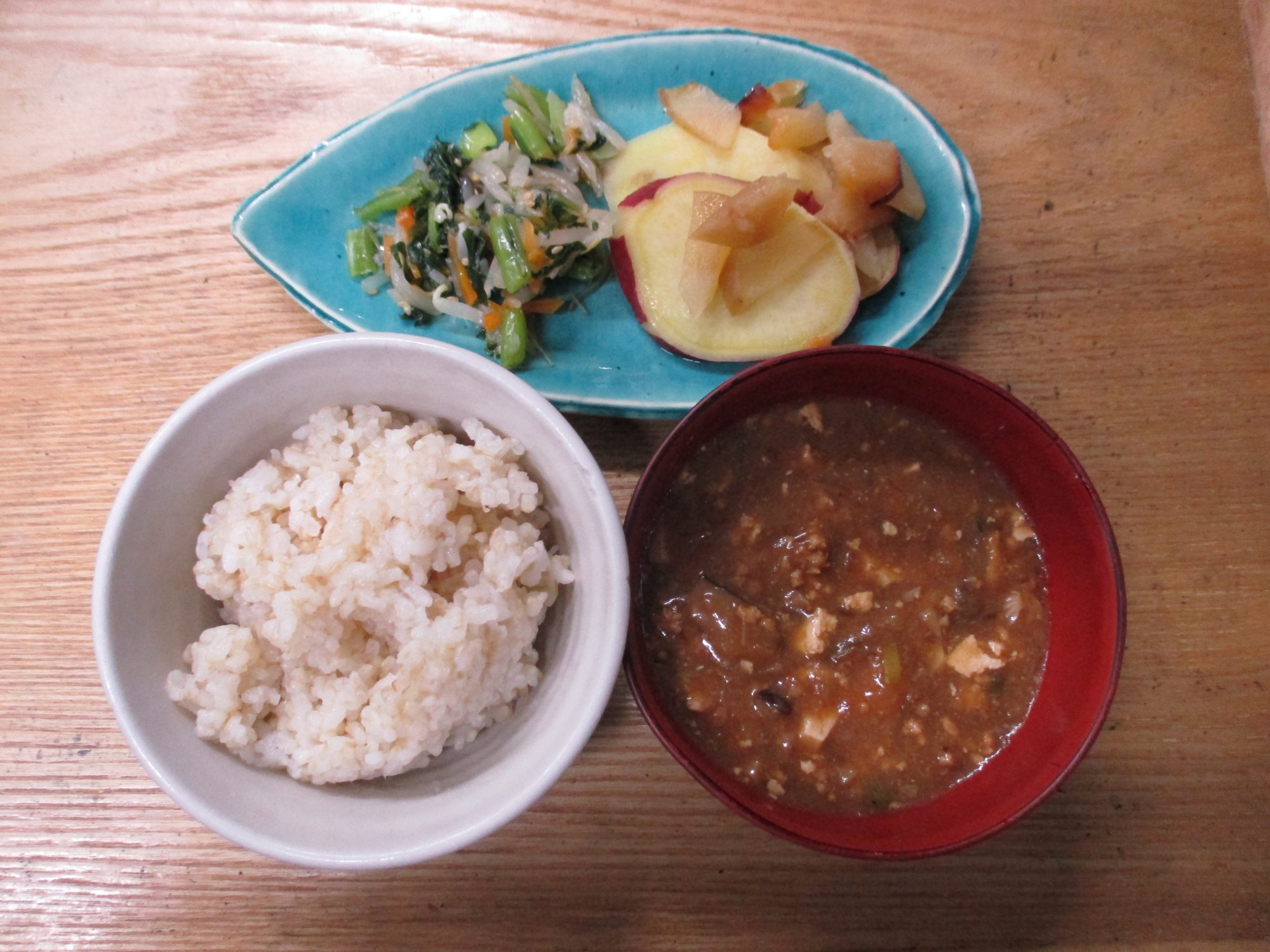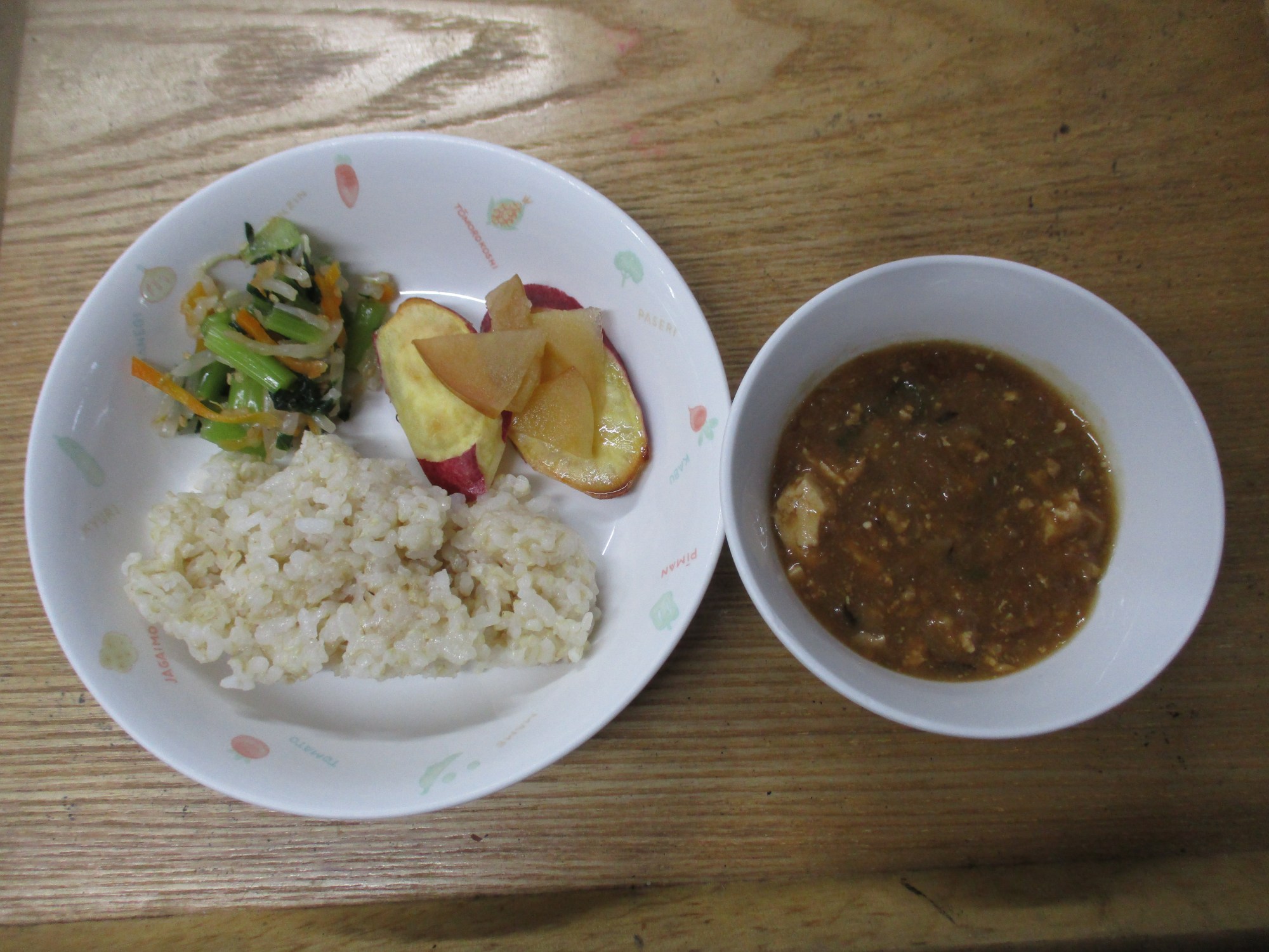 1枚目:【普通食:以上児】麻婆豆腐・さつま芋とりんごの甘煮・小松菜のナムル