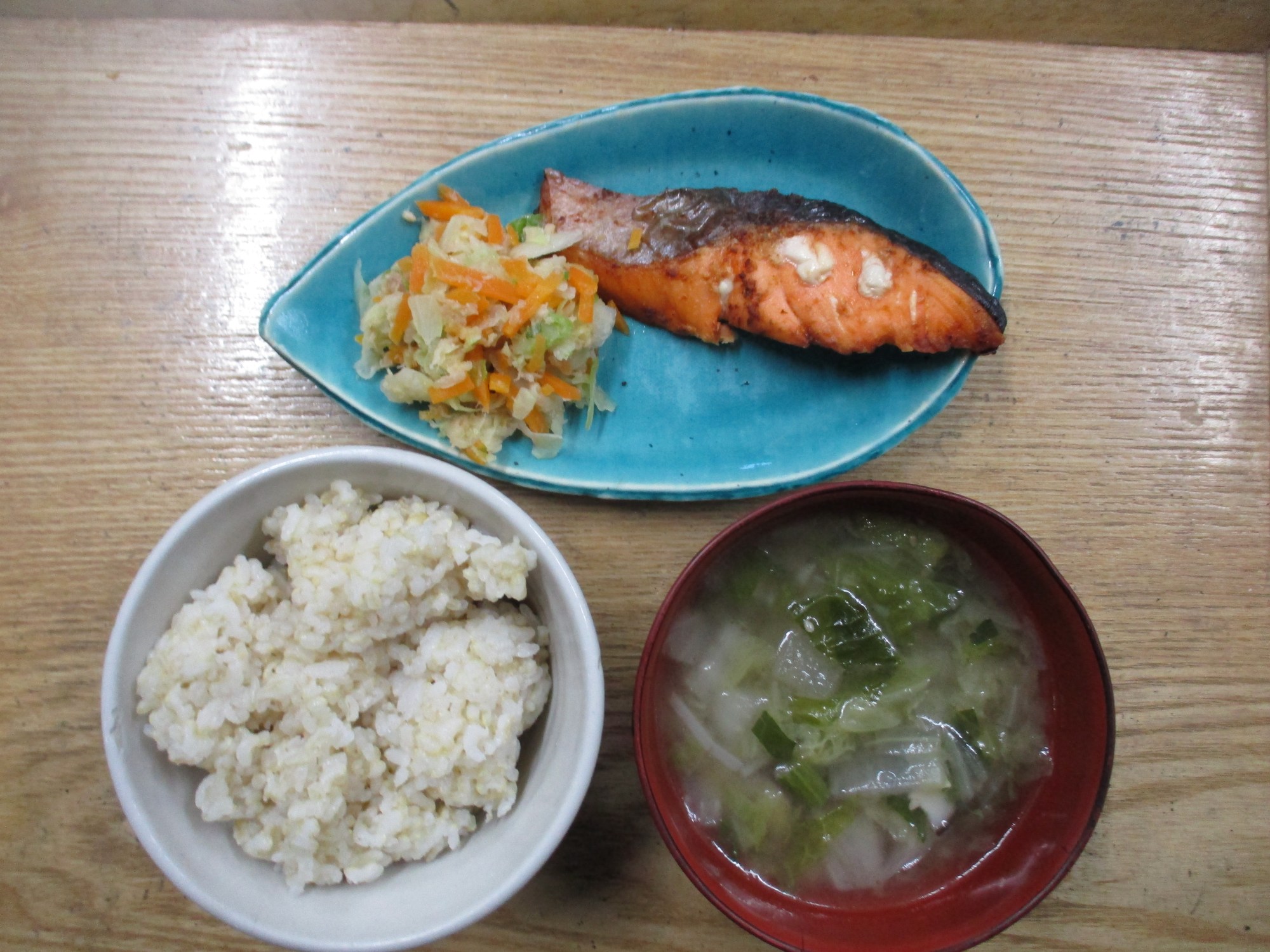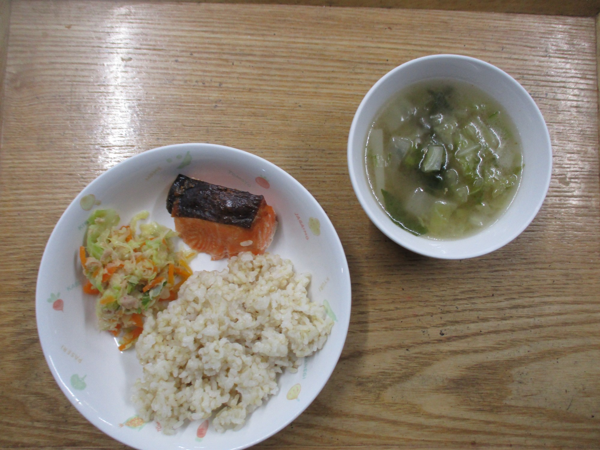 1枚目:【普通食:以上児】サケの塩醤油バター焼き・人参しりしりサラダ・大根スープ