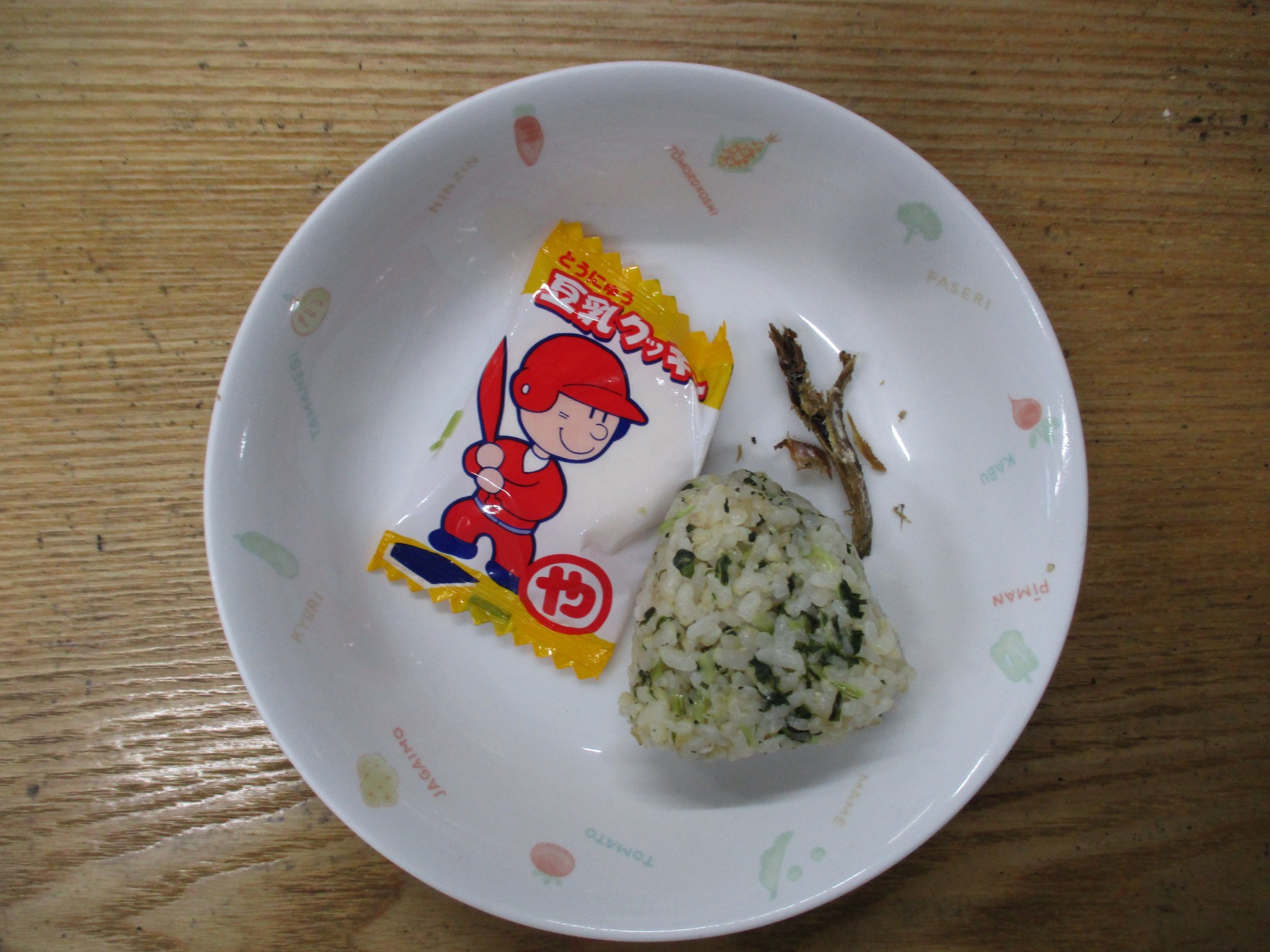 2枚目:【おやつ:以上児】水菜のおにぎり・甘辛じゃこ・お菓子