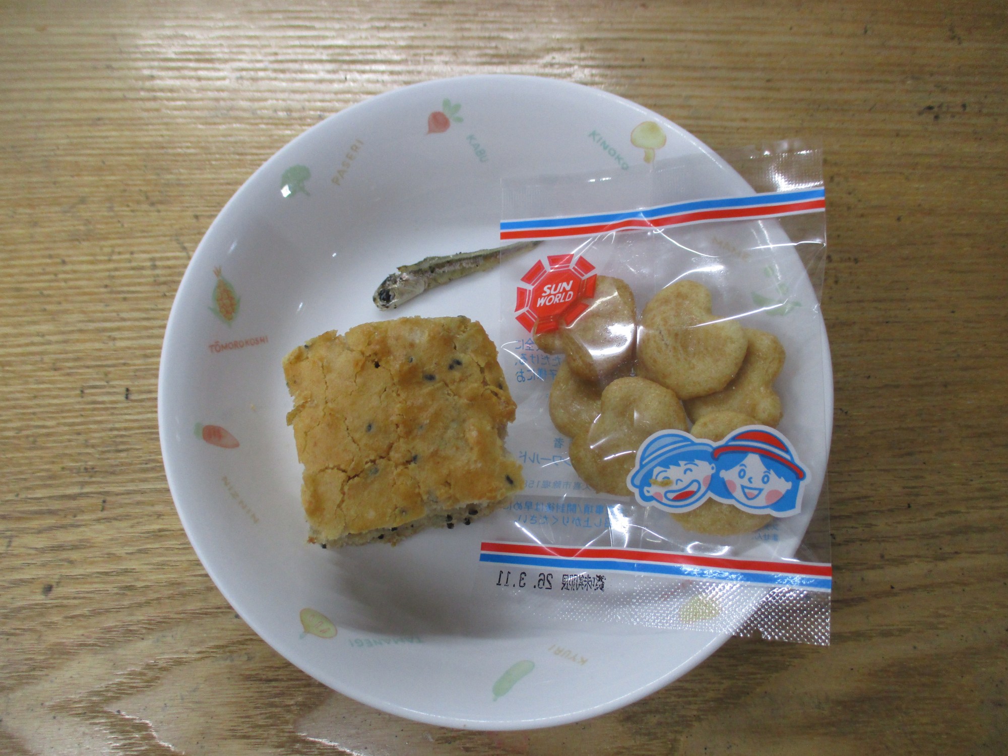 2枚目:【おやつ:以上児】黒ごまきな粉ケーキ・ゆかりじゃこ・お菓子