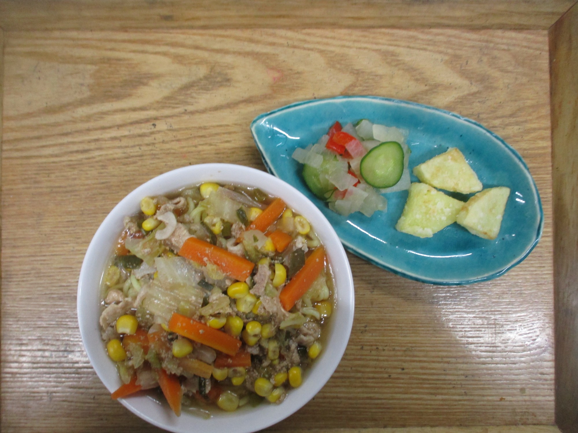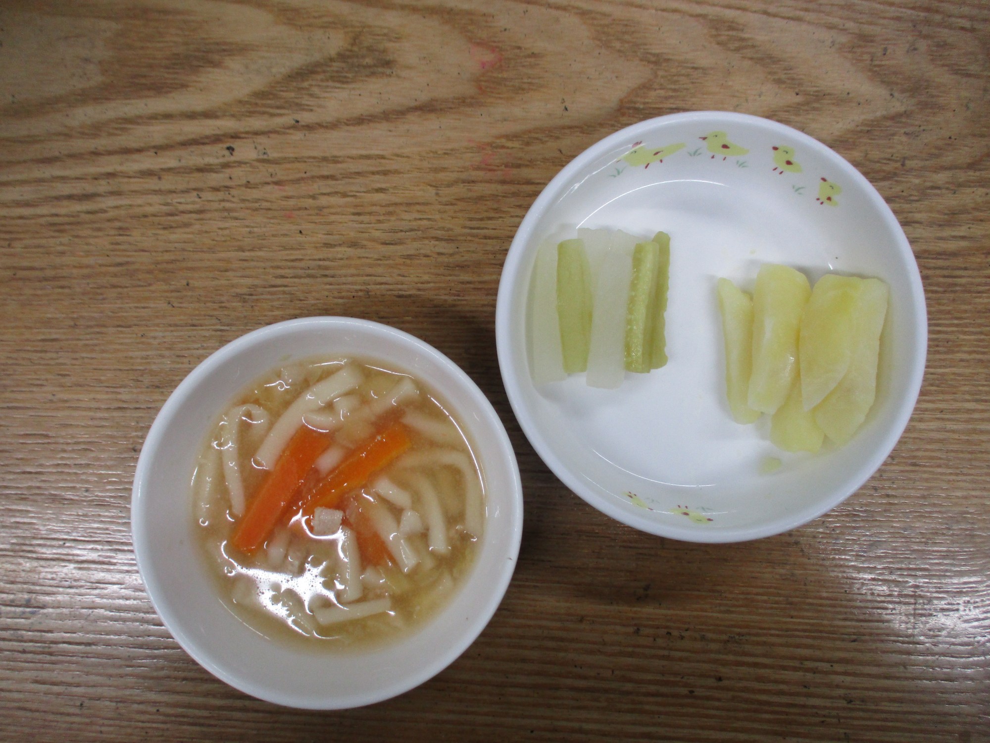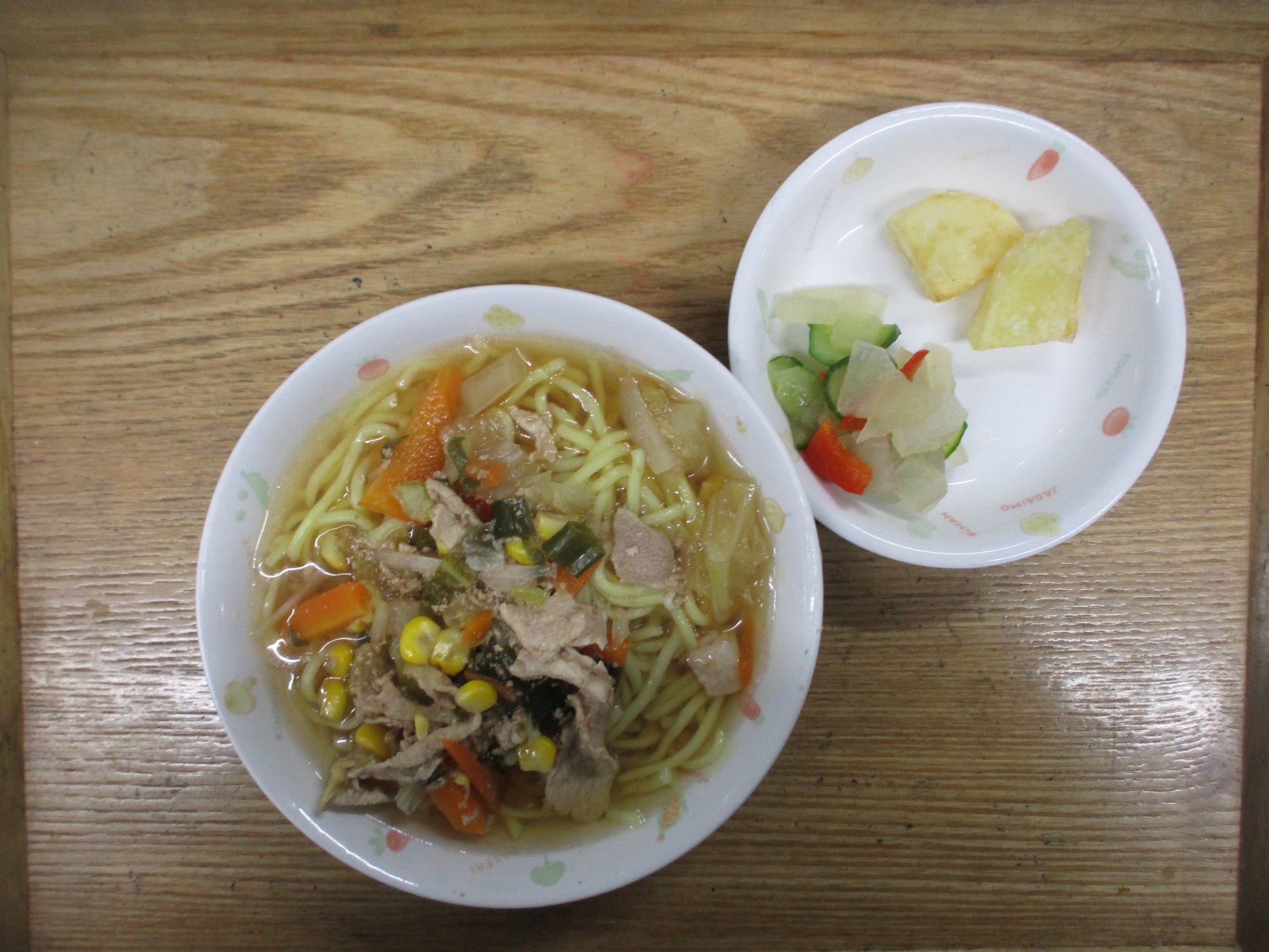 1枚目:【普通食:以上児】醤油ラーメン・じゃが芋の唐揚げ・胡瓜の和え物