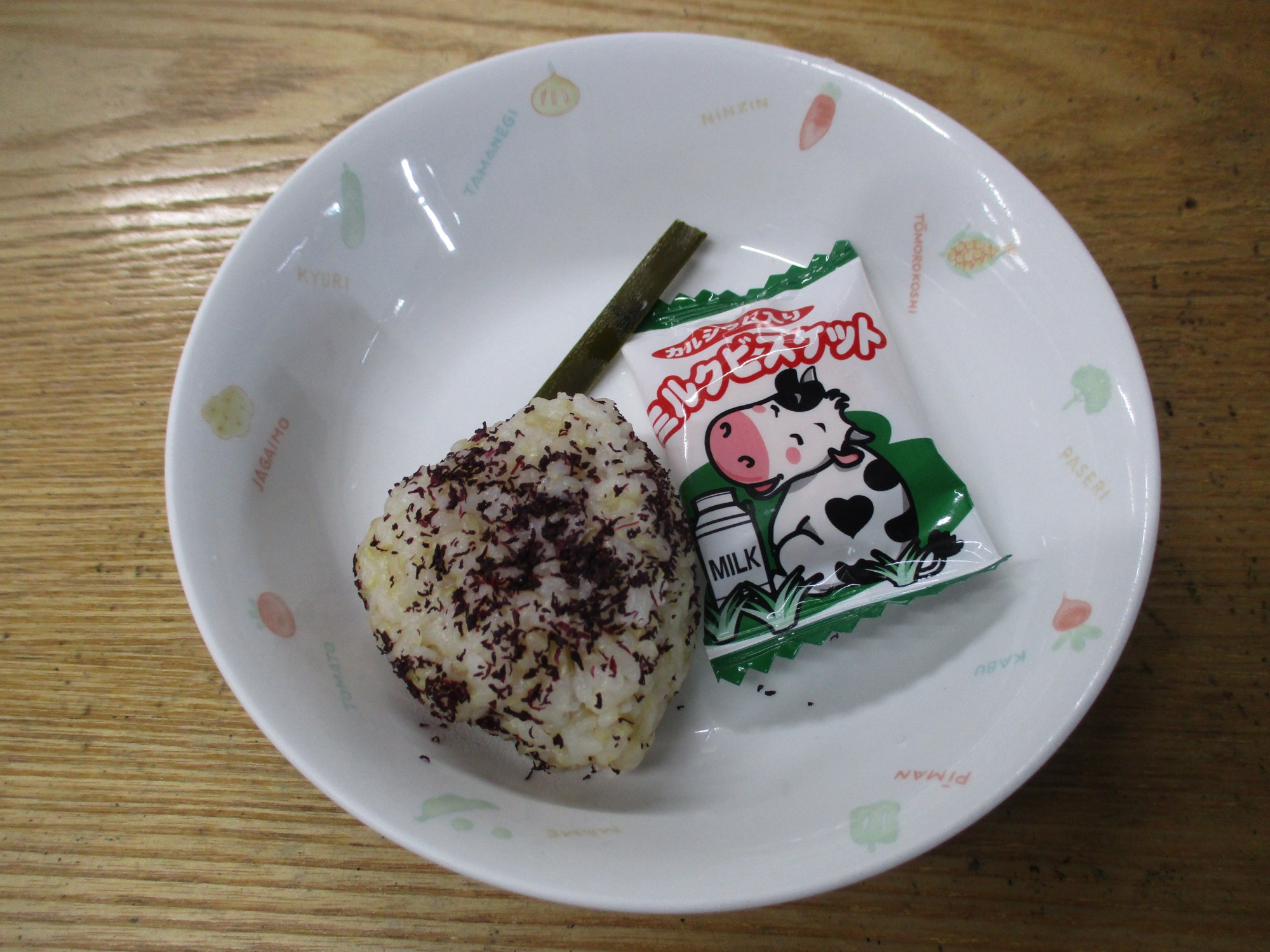 2枚目:【おやつ:以上児】ゆかりおにぎり・甘辛こんぶ・お菓子