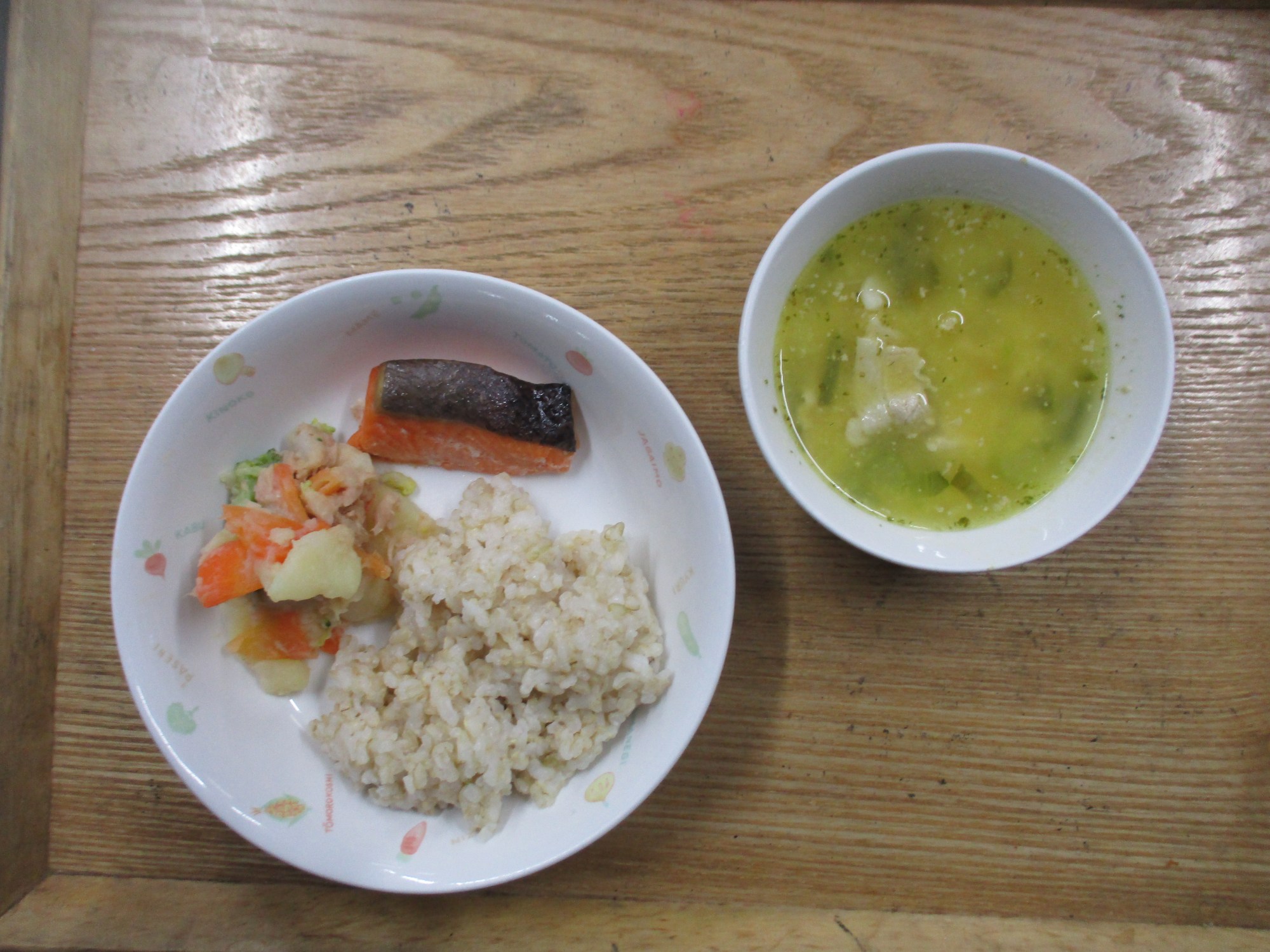 1枚目:【普通食:以上児】サケの醤油ソテー・ポテトサラダ・コーンスープ