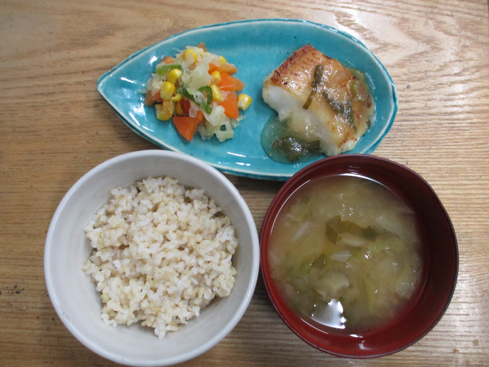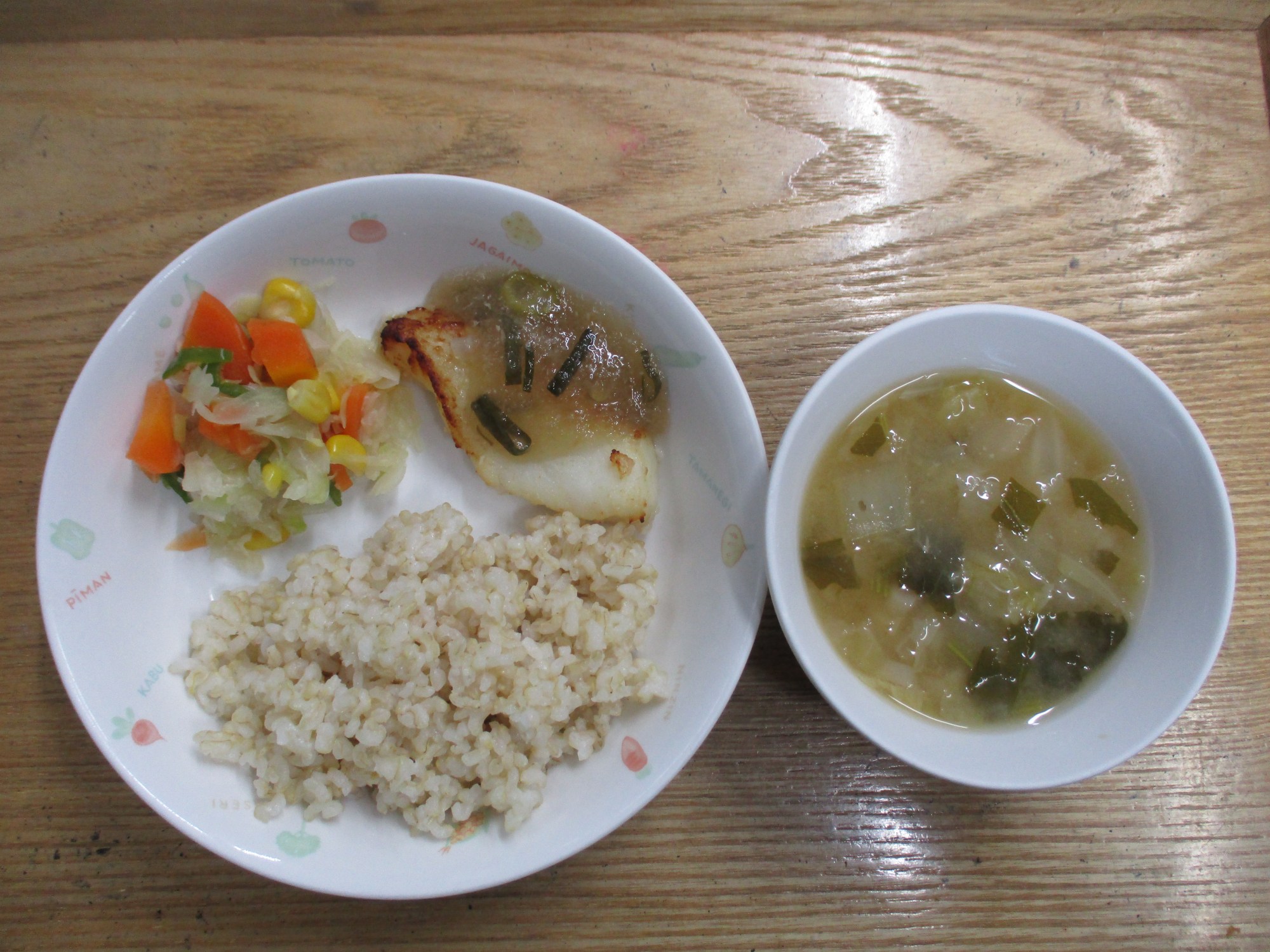 1枚目:【普通食:以上児】カレイのおろしあんかけ・キャベツの和え物・白菜とかぶのみそ汁