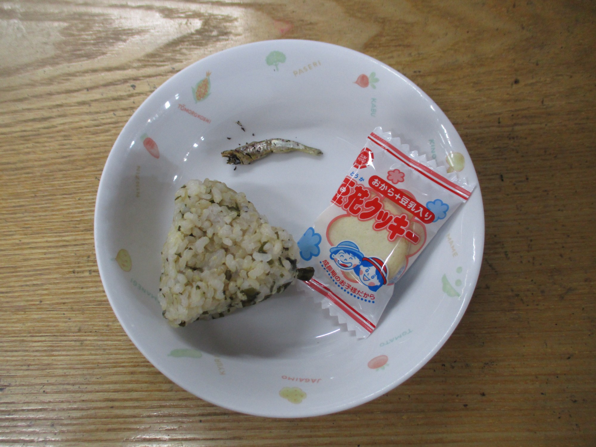 2枚目:【おやつ:以上児】わかめおにぎり・ゆかりじゃこ・お菓子