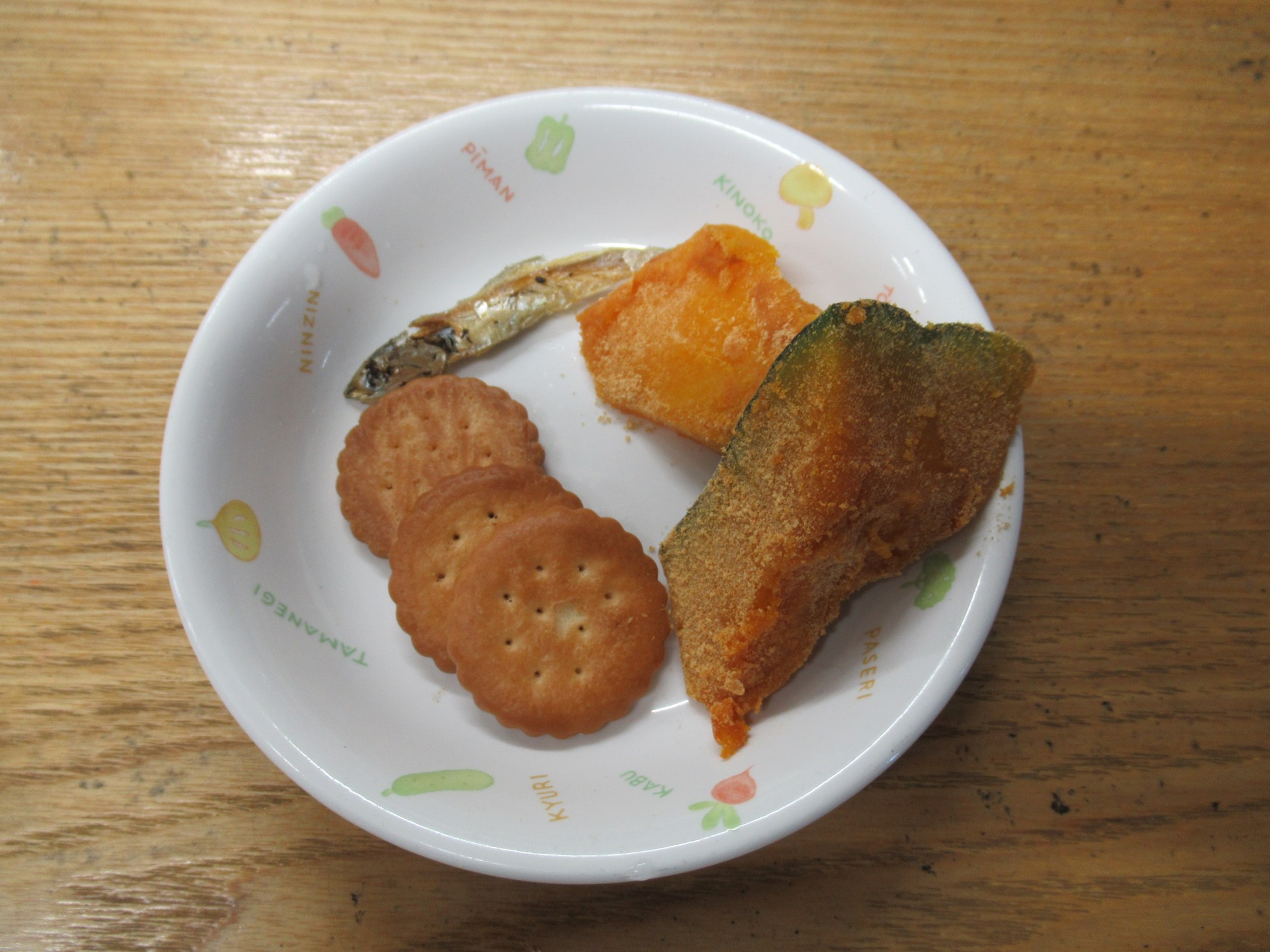 2枚目:【おやつ:未満児】南瓜のきな粉和え・ゆかりじゃこ・お菓子