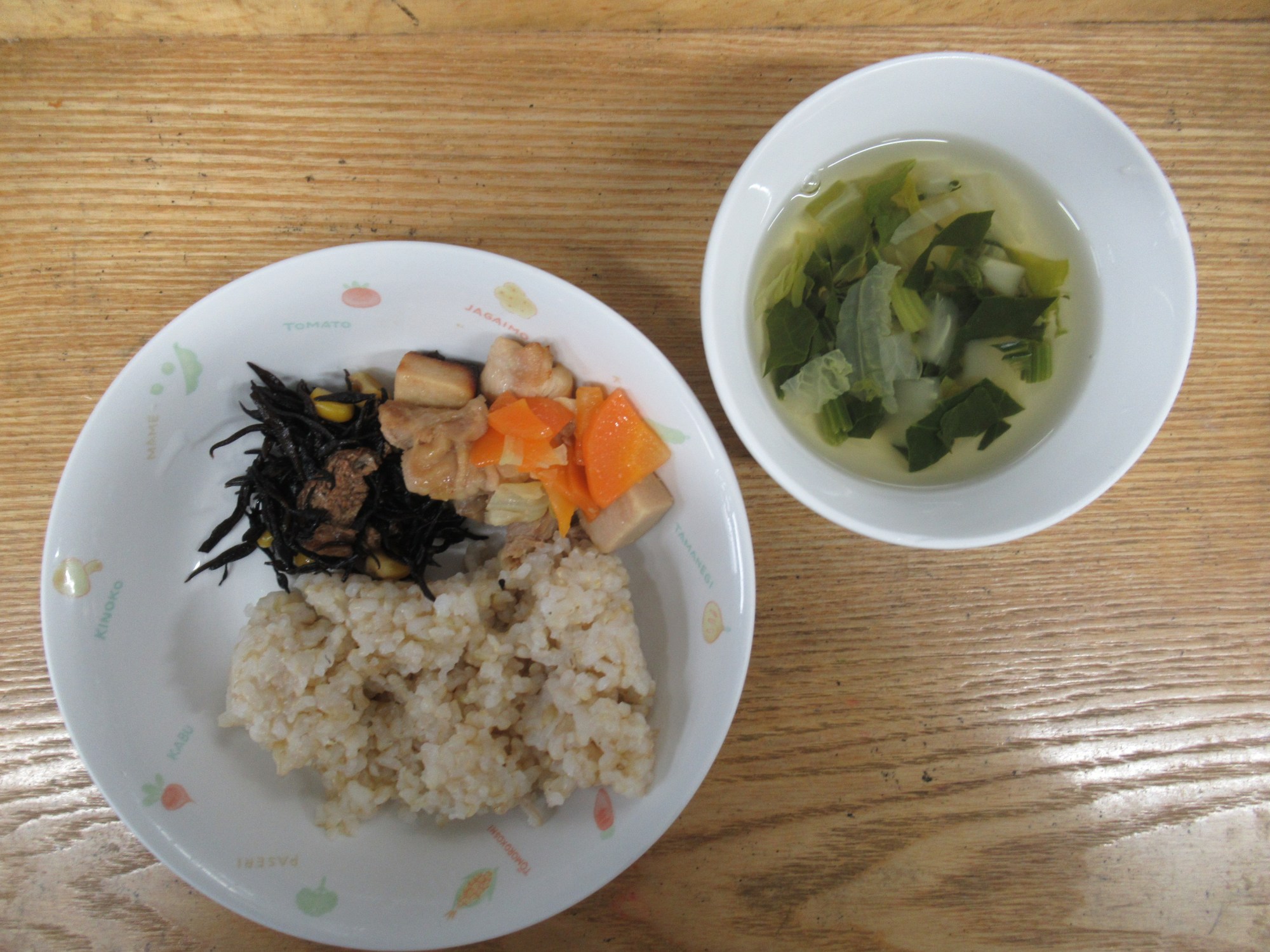 1枚目:【普通食:以上児】鶏肉と高野豆腐の甘辛焼き・ひじきの煮物・大根のすまし汁