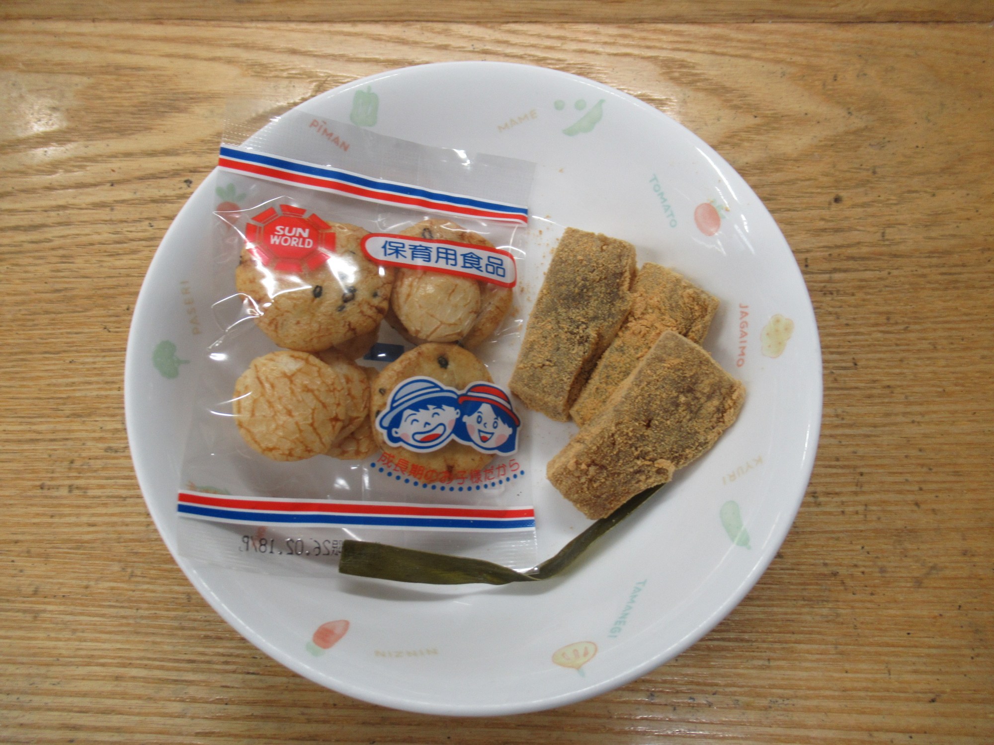 2枚目:【おやつ:以上児】黒糖くずもち・甘辛こんぶ・お菓子