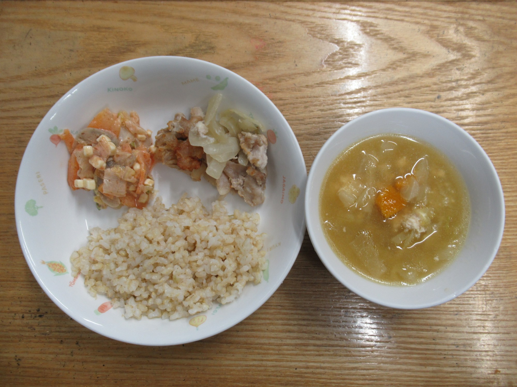 1枚目:【普通食:以上児】豚肉の塩焼き・人参のオーロラ和え・鶏そぼろみそ汁