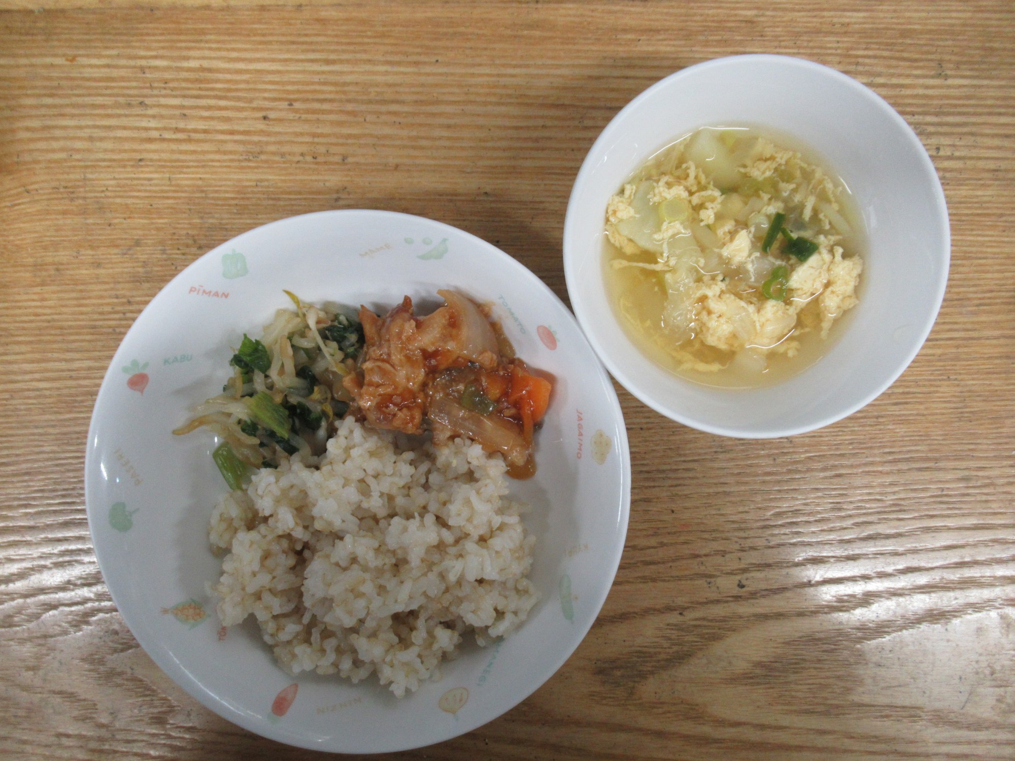 1枚目:【普通食:以上児】酢豚・もやしの中華和え・卵スープ