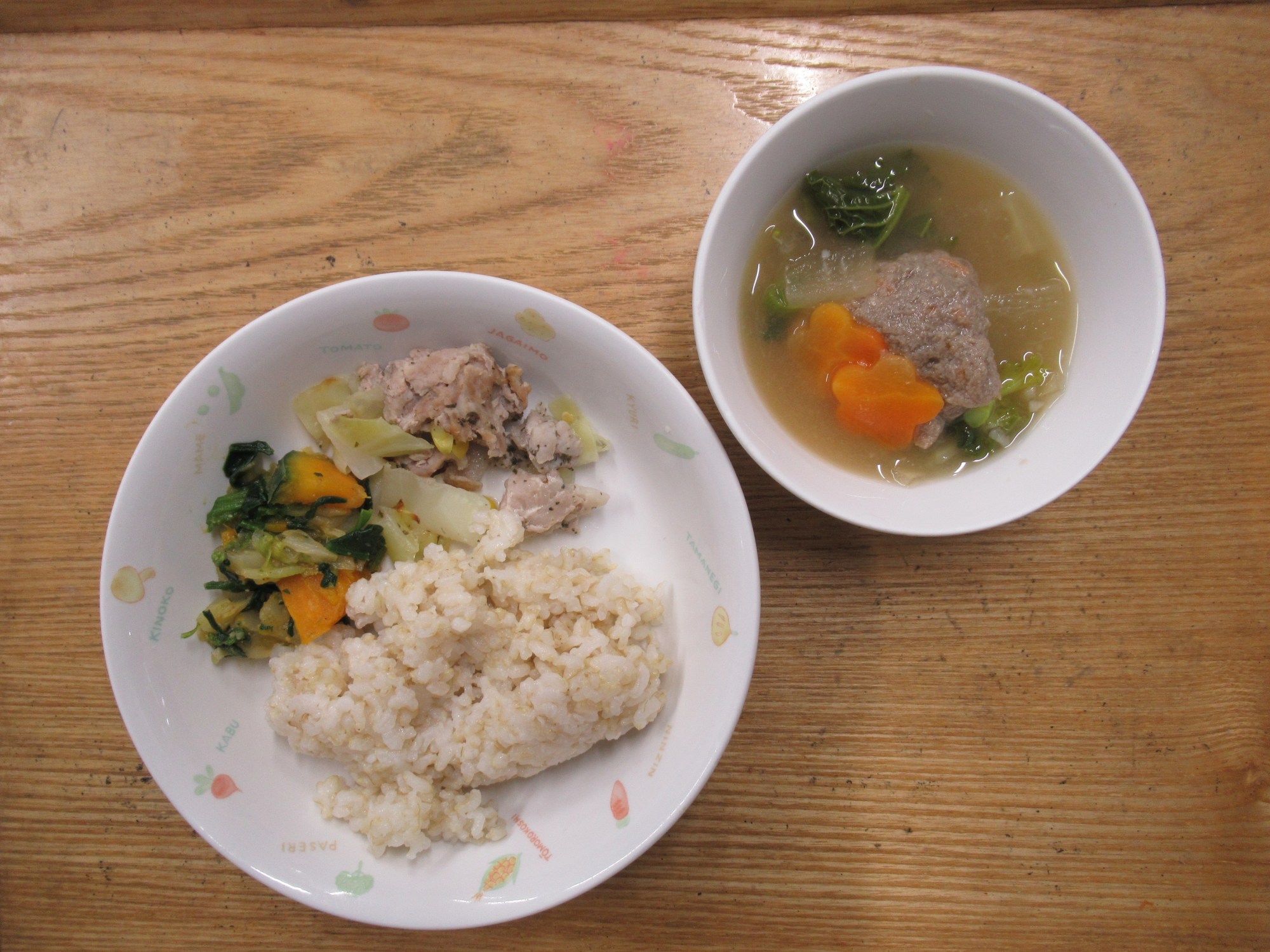 1枚目:【普通食:以上児】豚肉のゆかり焼き・白菜のごまきな粉和え・菜の花といわしのつみれみそ汁