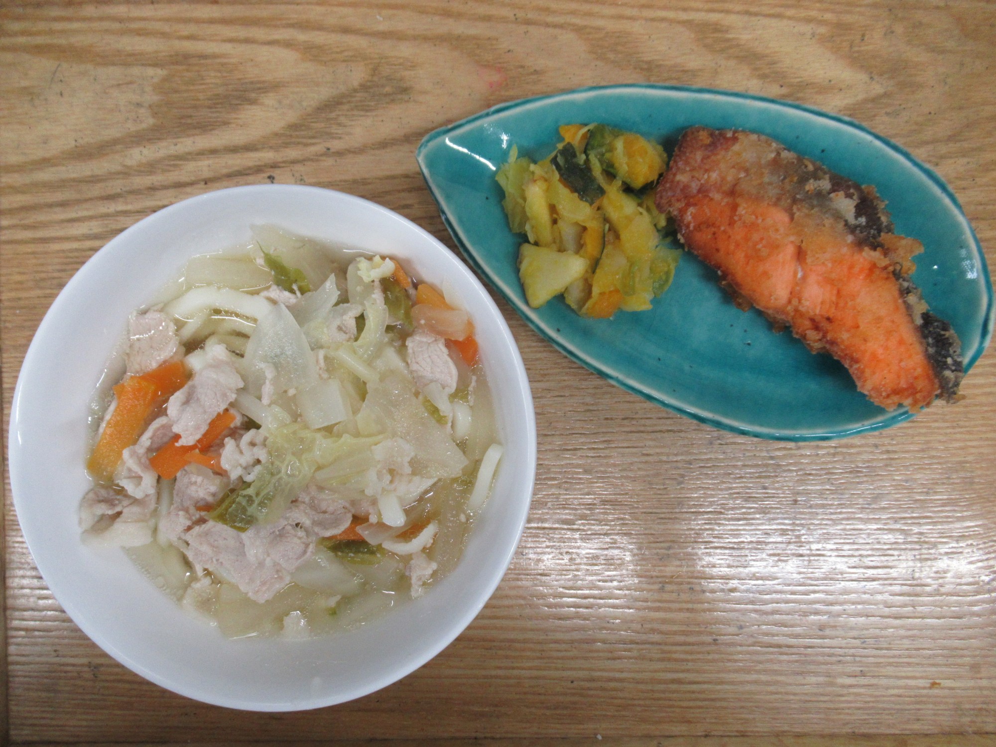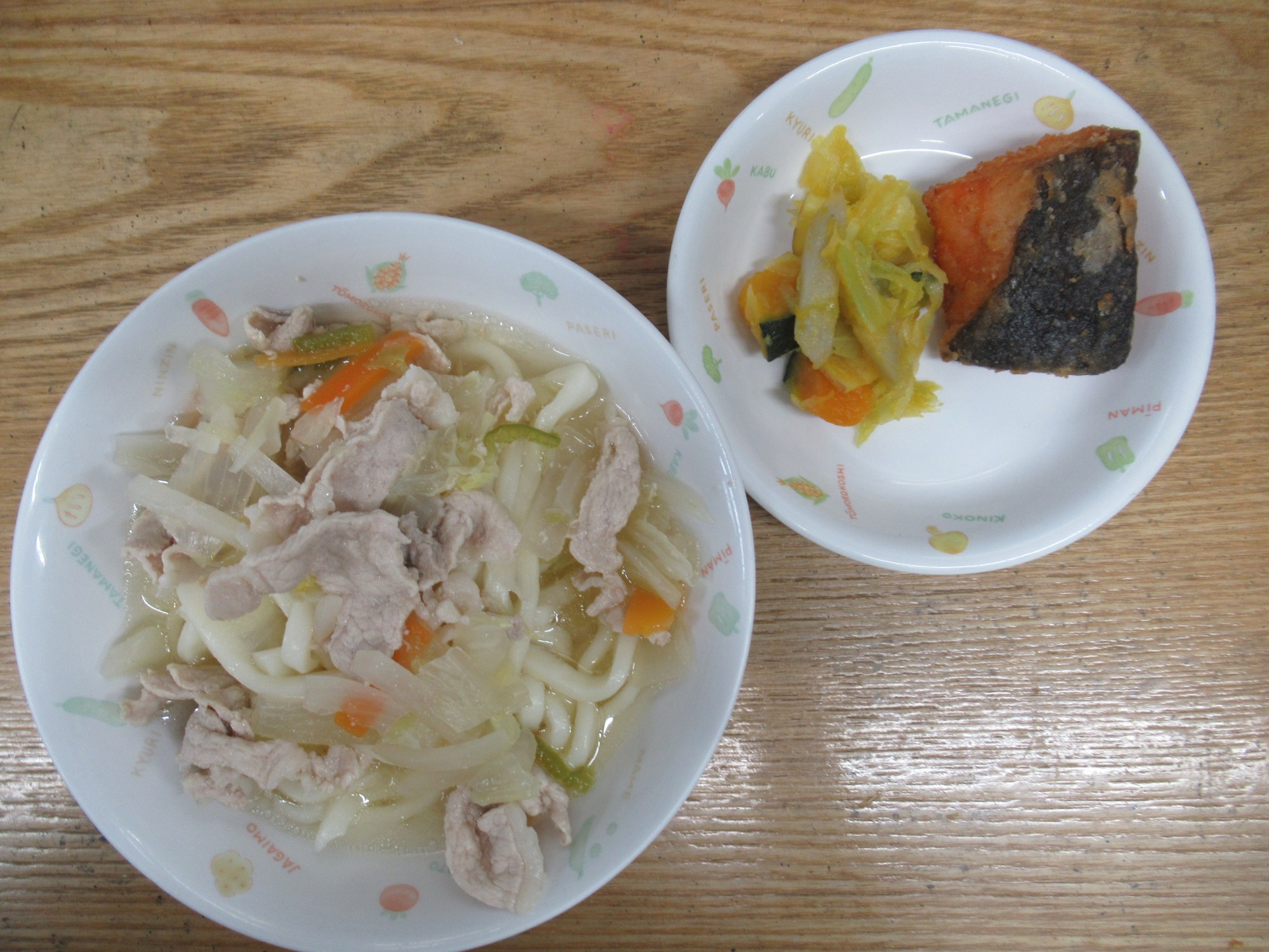 1枚目:【普通食:以上児】醤油うどん・サケの唐揚げ・野菜たっぷりサラダ