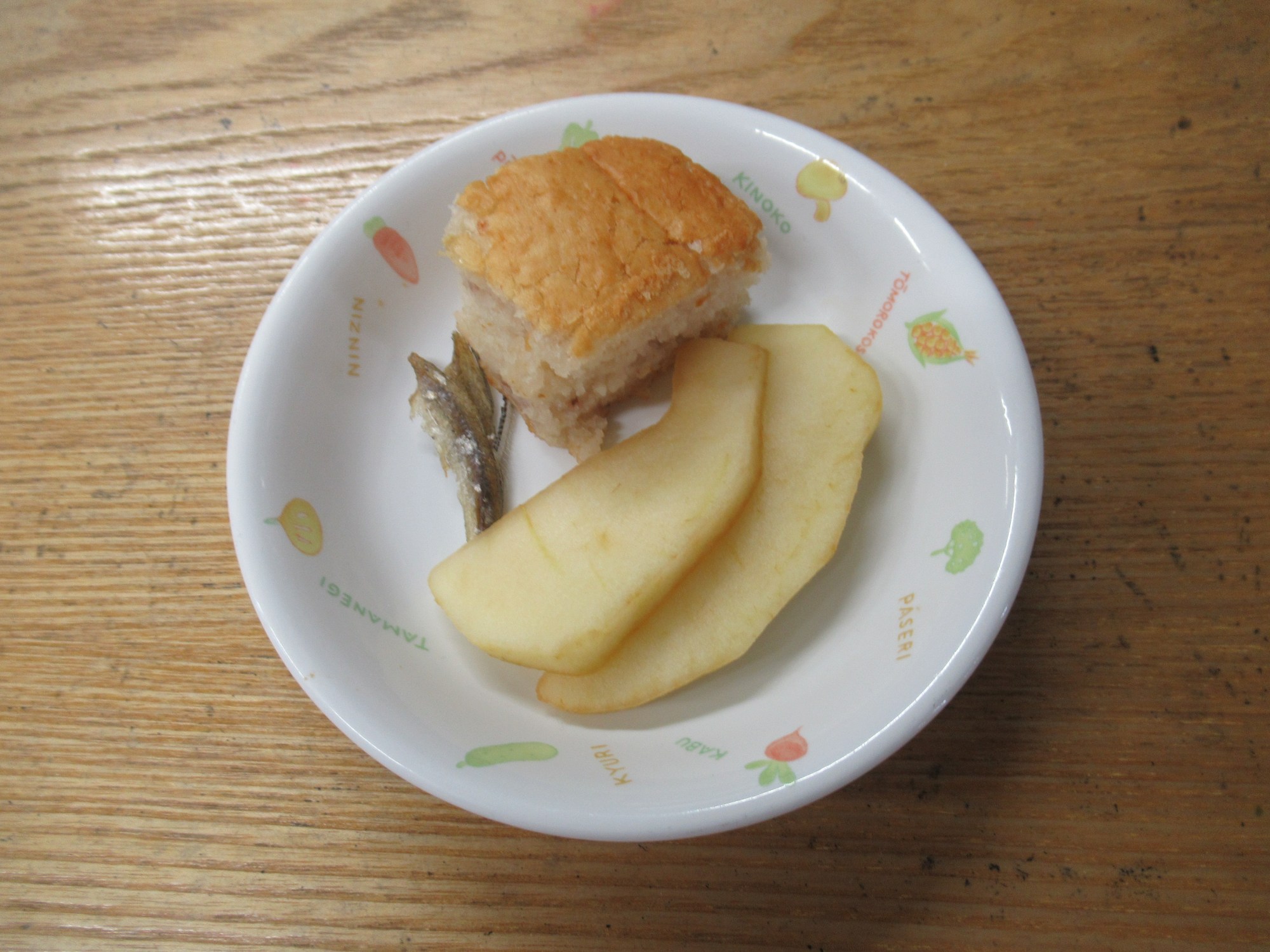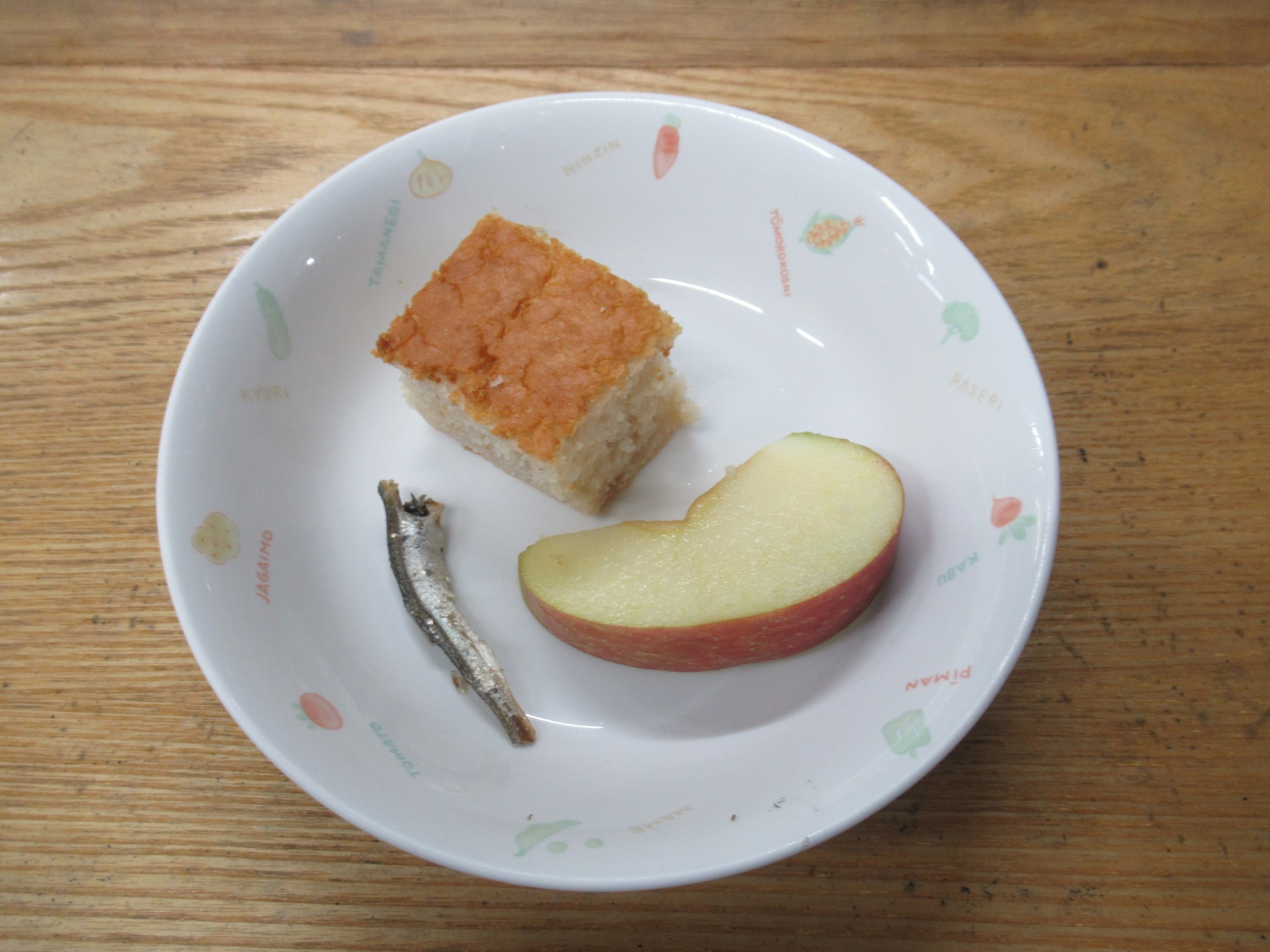 2枚目:【おやつ:以上児】ジャムのホットケーキ・甘辛じゃこ・くだもの