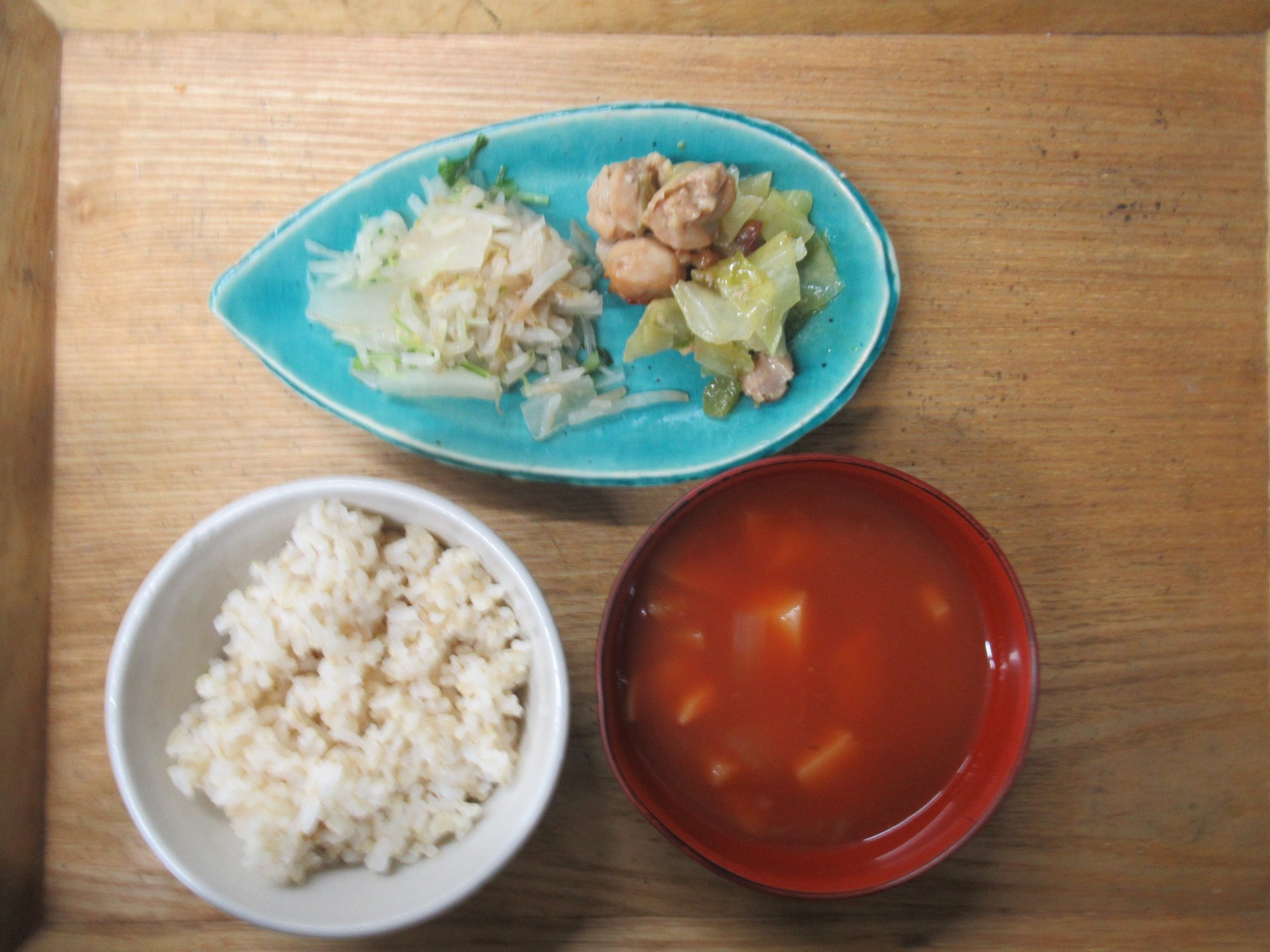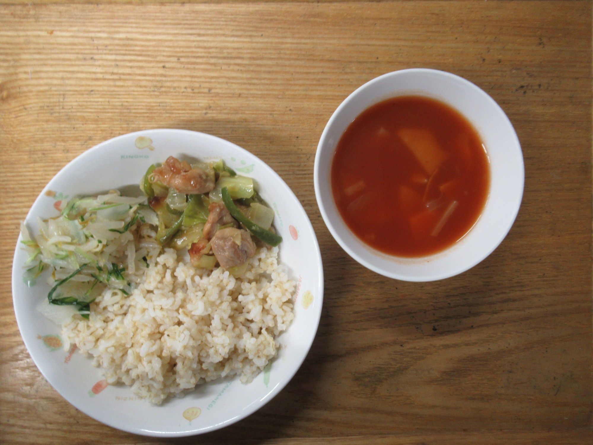 1枚目:【普通食:以上児】鶏肉のガリバタチーズ炒め・水菜と大根のはりはりサラダ・ミネストローネ