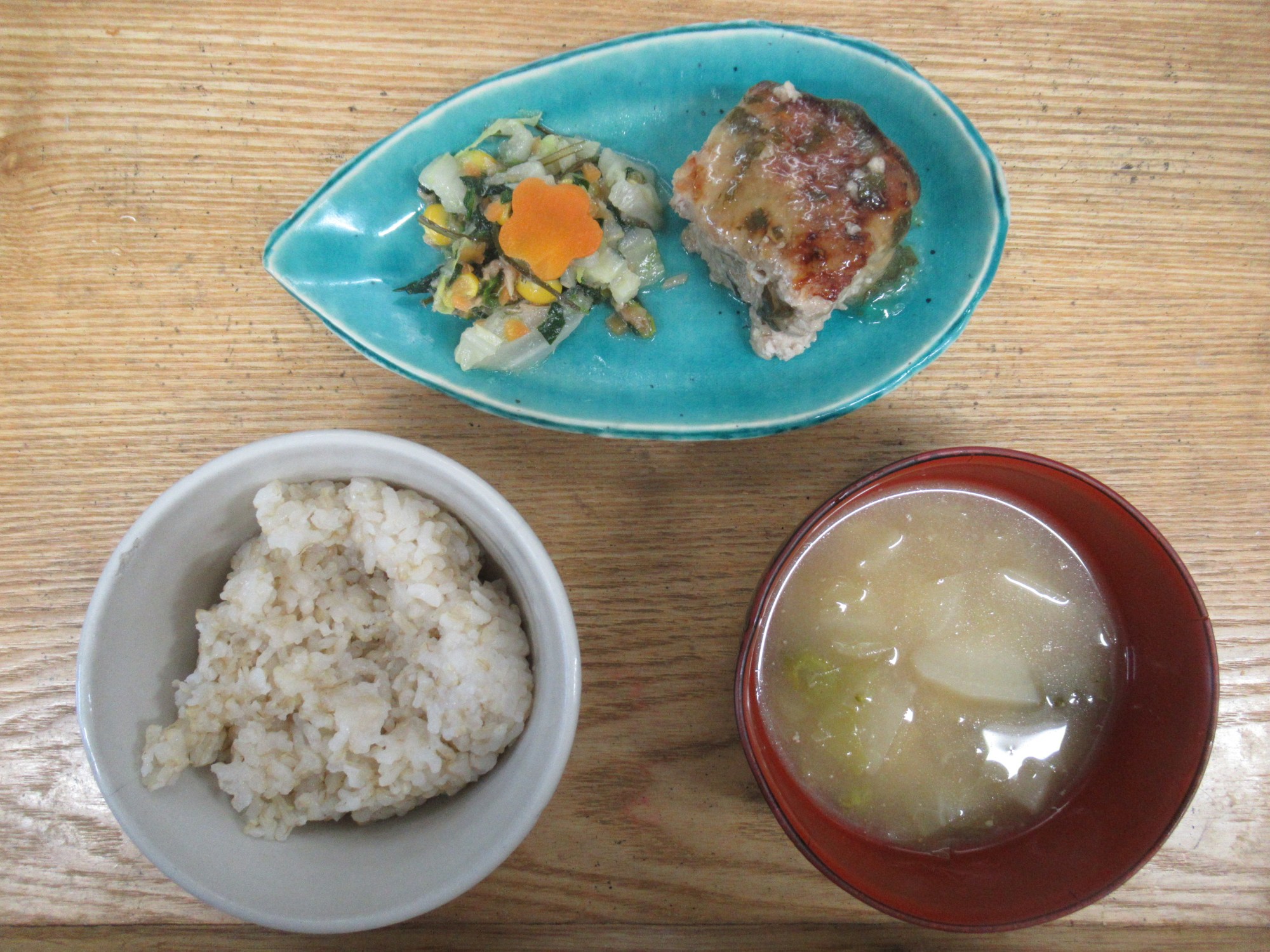 1枚目:【普通食:以上児】おろしポン酢ハンバーグ・白菜とツナの昆布和え・ごまみそ汁
