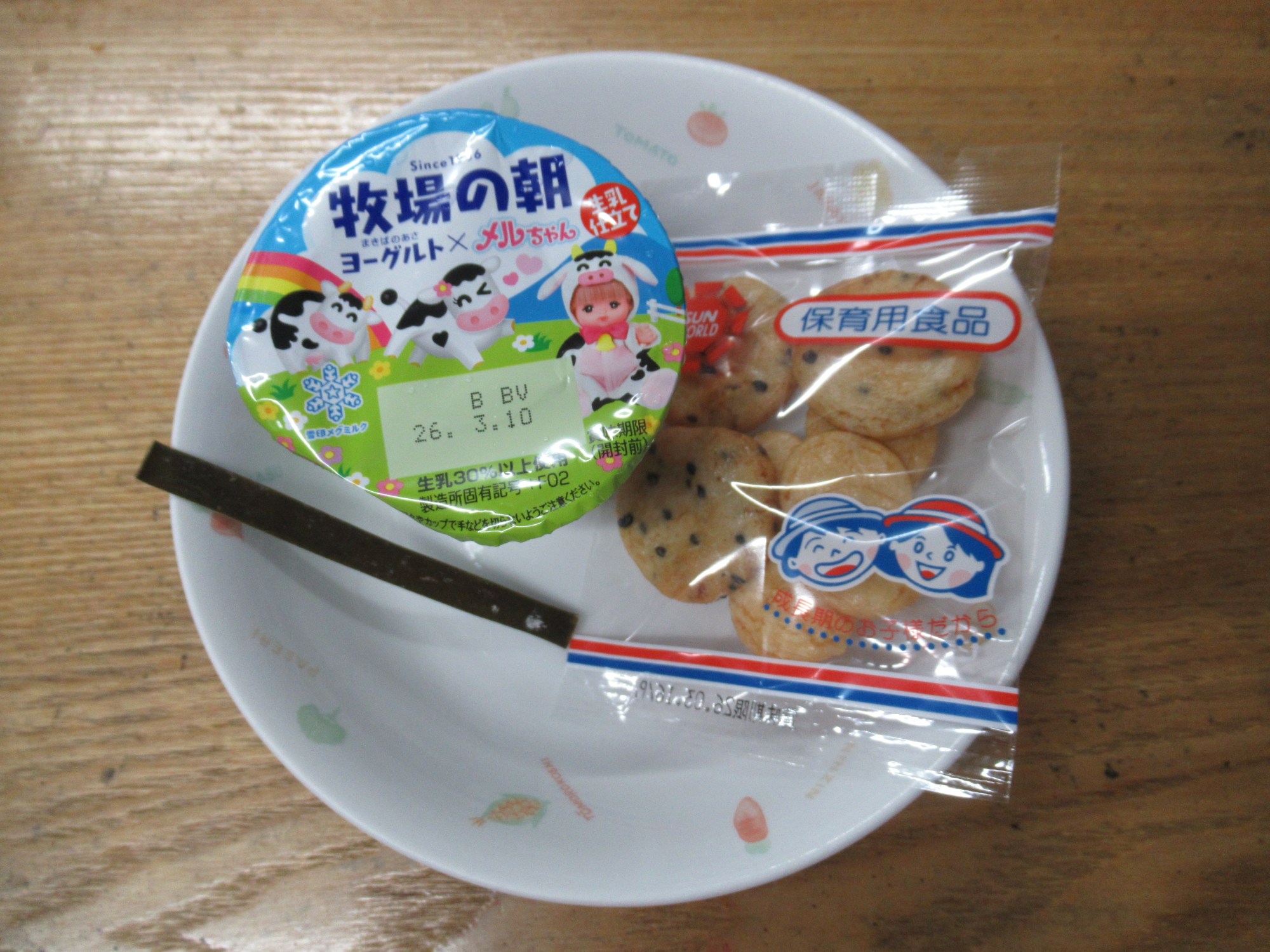2枚目:【おやつ:以上児】ヨーグルト・パリパリこんぶ・せんべい