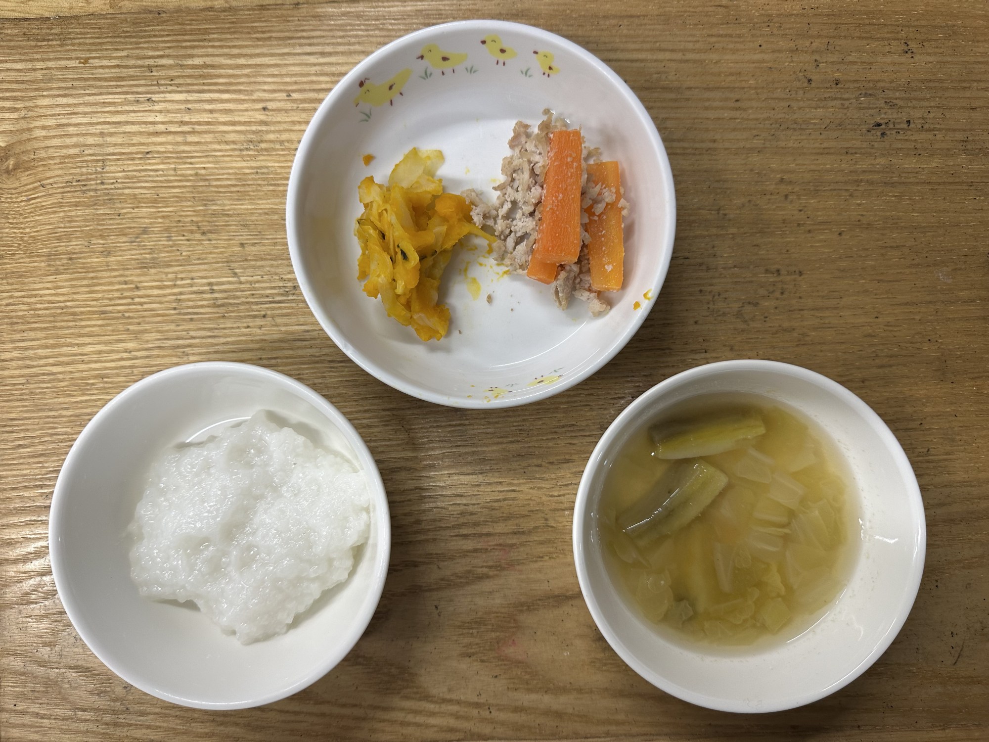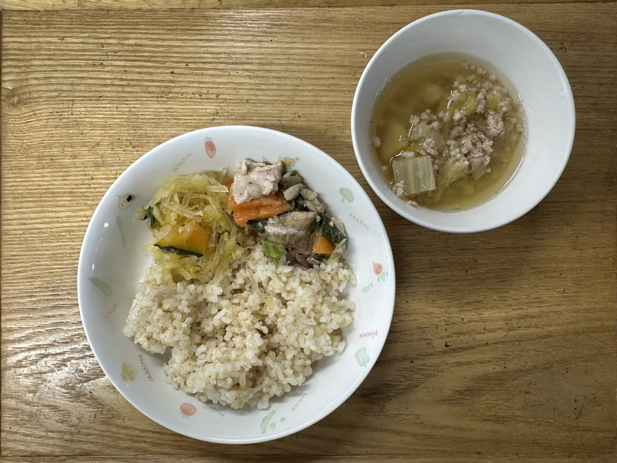 2枚目:【普通食:未満児】豚肉とチンゲン菜のあん炒め・のりと春雨の和え物・そぼろみそ汁