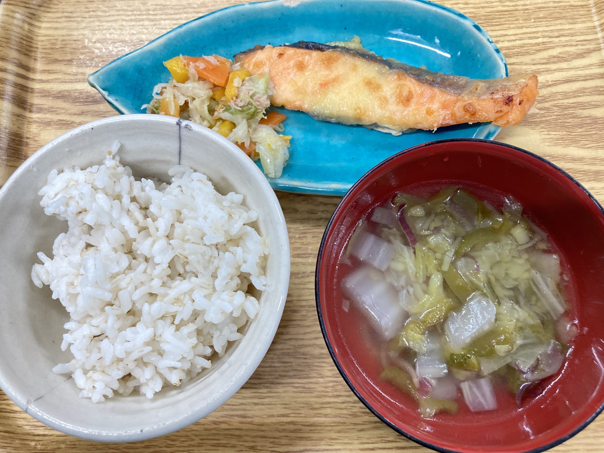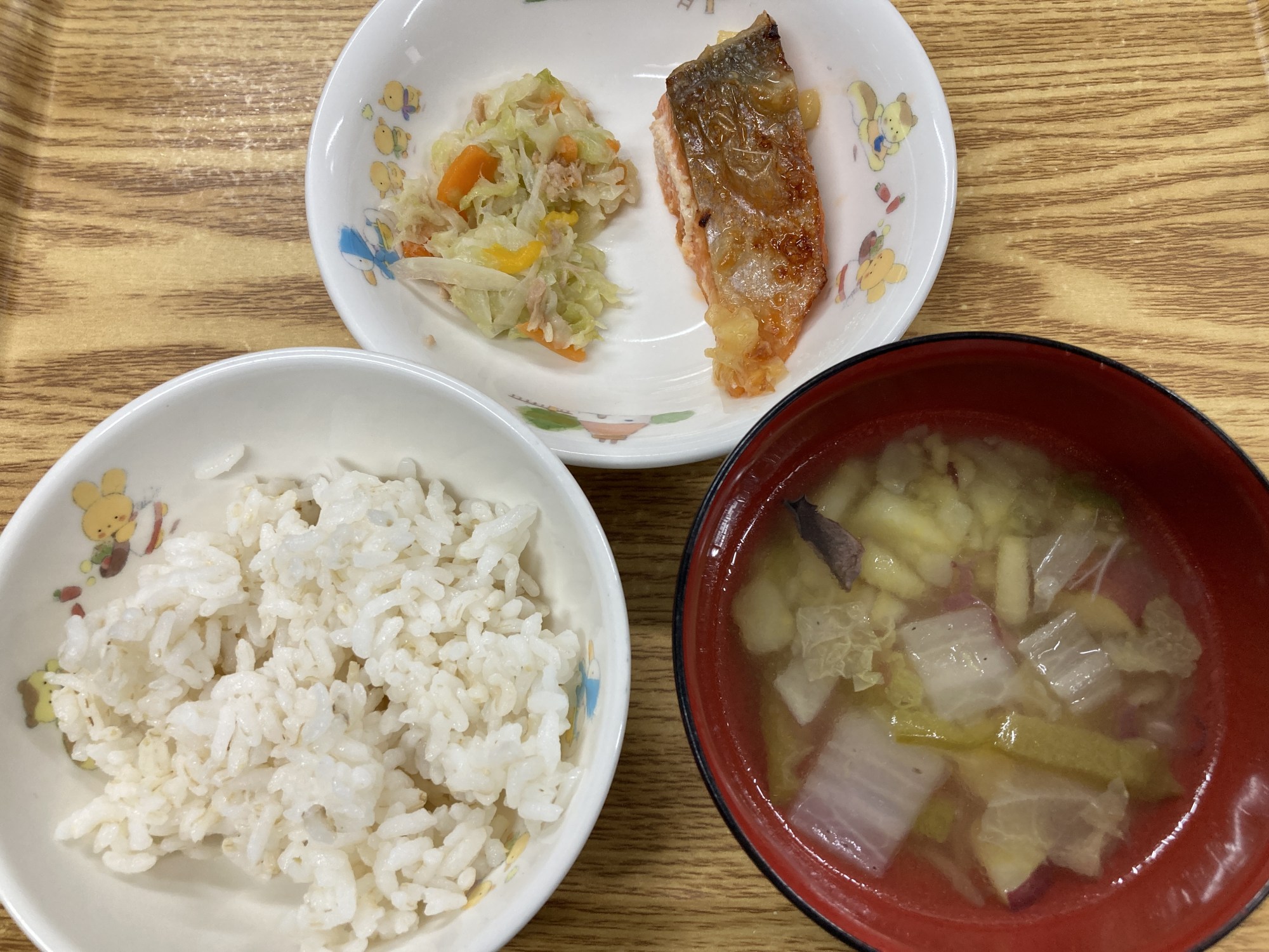 1枚目:【普通食:以上児】サケのチーズ焼き・人参しりしりサラダ・白菜とお芋のスープ