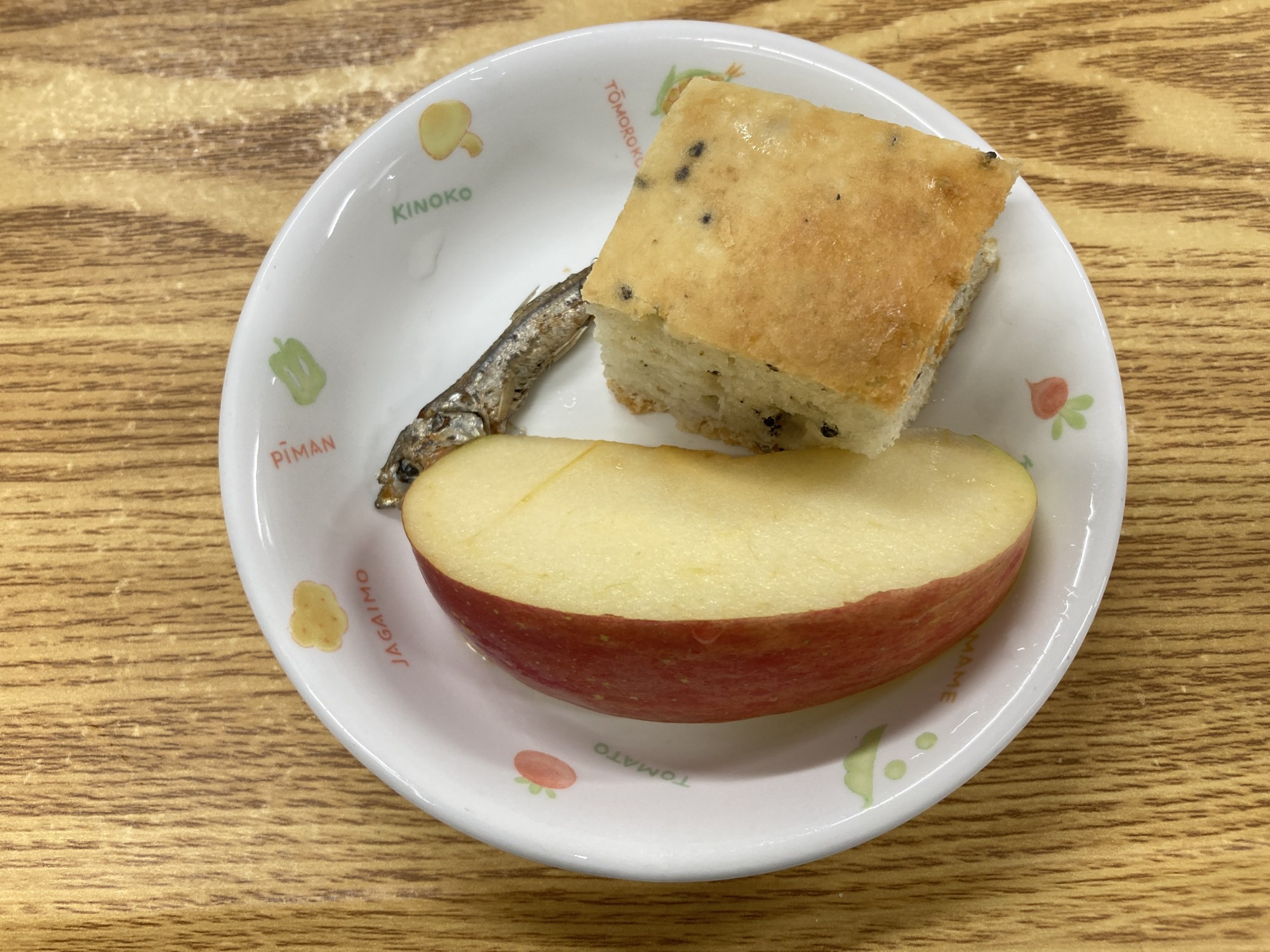 2枚目:【おやつ:以上児】♪黒ごまケーキ・♪甘辛じゃこ・くだもの
