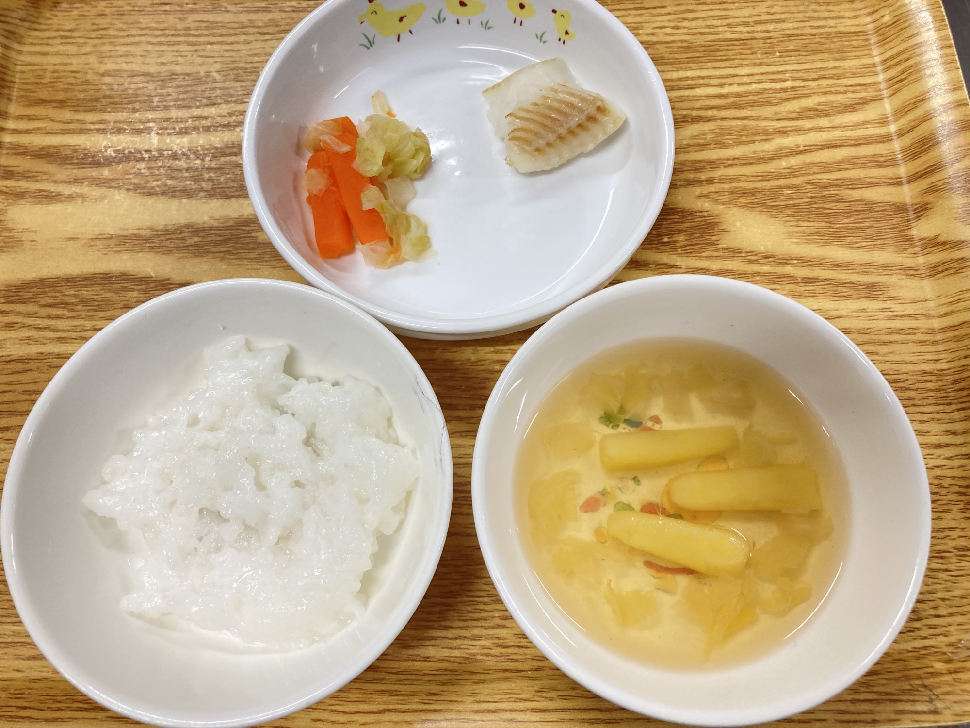 5枚目:【離乳食】カレイのソテー・人参しりしりサラダ・お芋のスープ