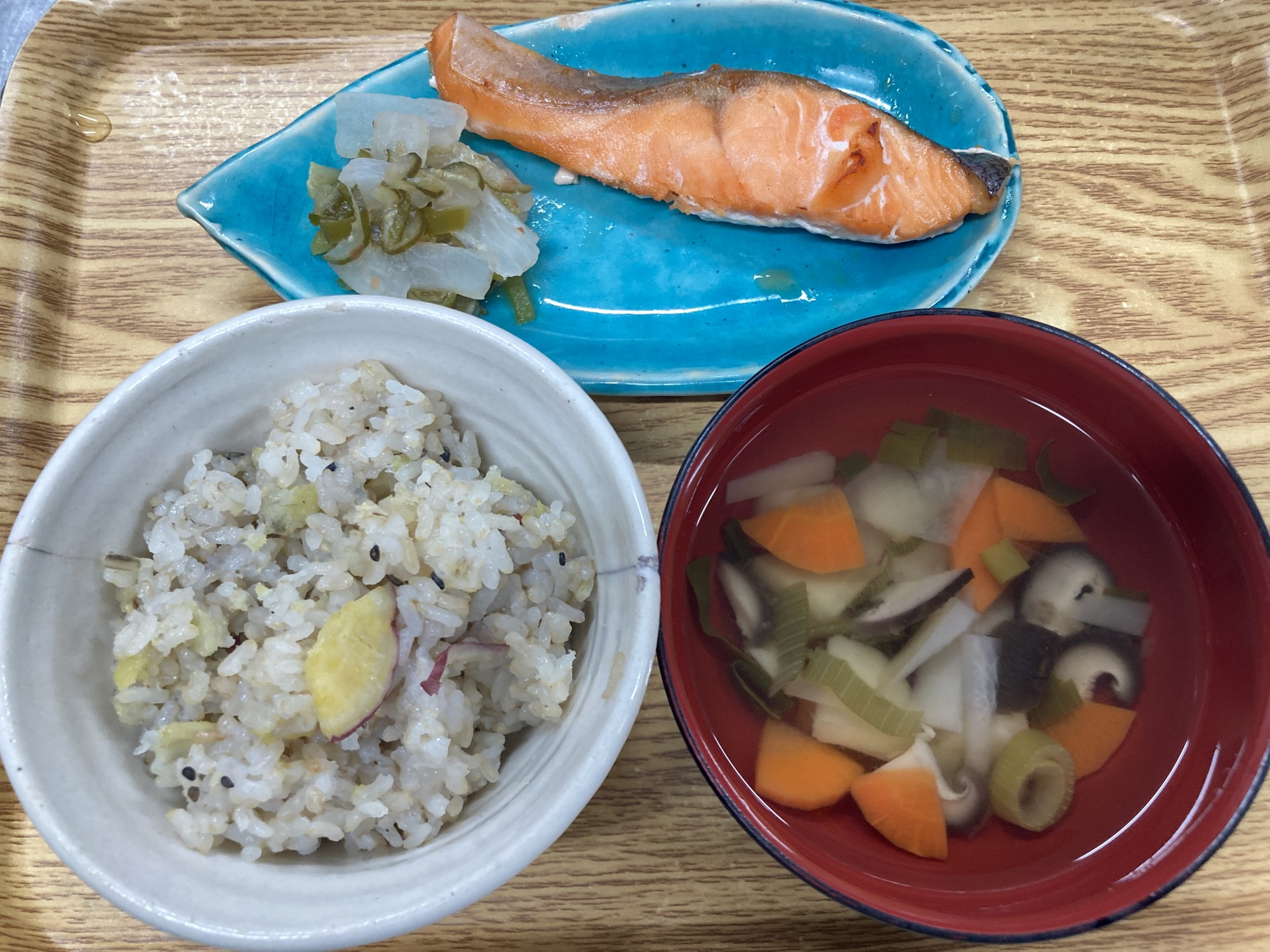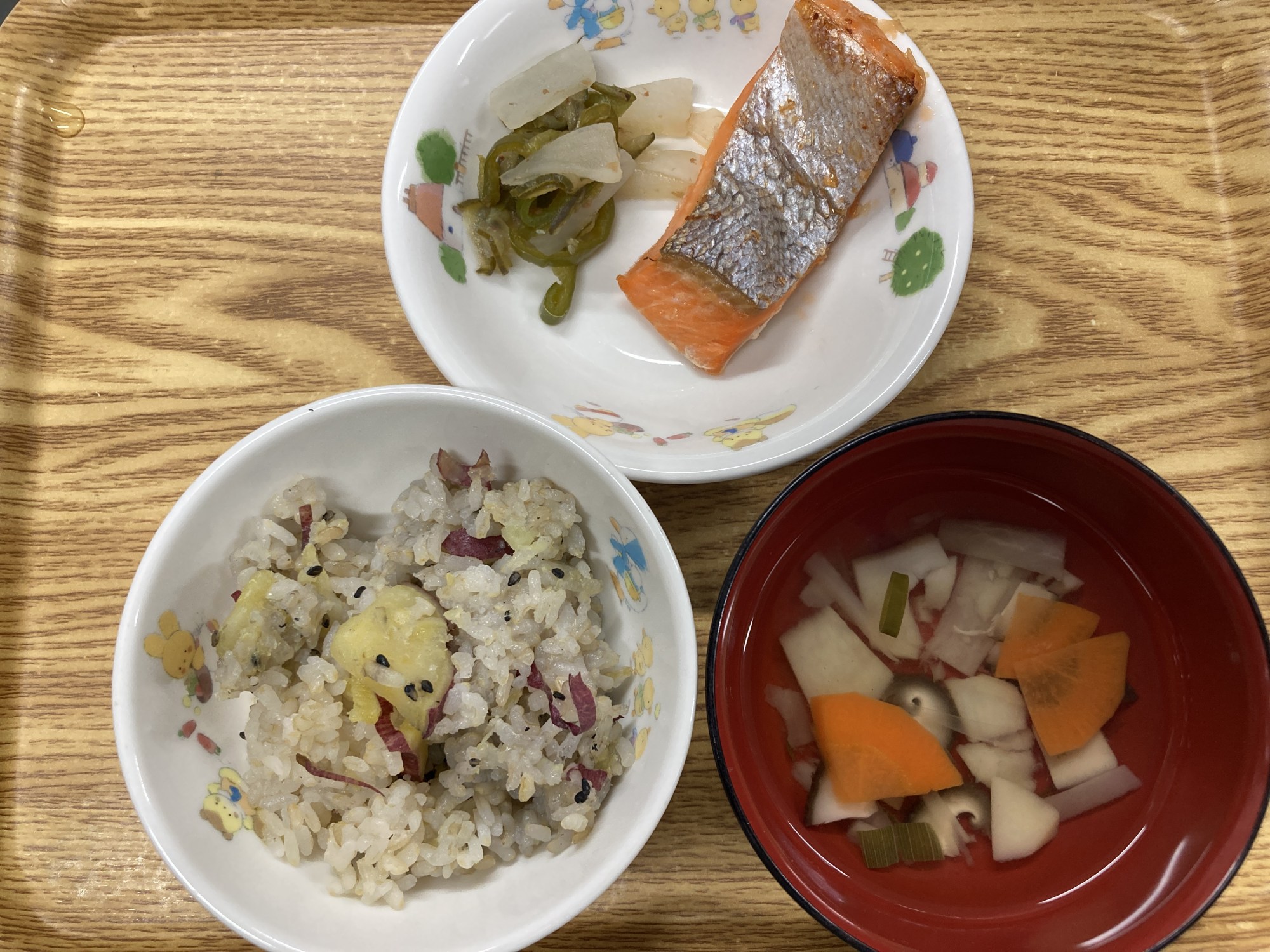 1枚目:【普通食:以上児】さつま芋ごはん・サケの醤油焼き・梅和え・お吸い物